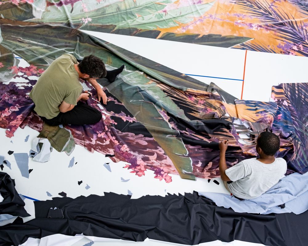Es gehört also zu seiner Herangehensweise, einen starken Bezug zu den spezifischen Örtlichkeiten hervorzuheben, um soziale Prozesse, einen Dialog und die Imagination anzustoßen. Für sein aktuelles Projekt unter dem Titel „A Day is a Hundred Years“ ging es dagegen wieder in sein kreatives Kraftzentrum, ins Decoratelier, welches Wouters seit 2019 mit Barry Ahmad Talib, einem Künstler aus Guinea, teilt. Beide verbrachten lange Wintermonate damit, tausende von Blättern aus Stoffbahnen auszuschneiden, welche wiederum die Grundlage für Talibs Baumskulpturen sind. Dieses Element floss in eine Gesamtkunstperformance ein, an der auch Handwerker:innen, Musiker:innen oder Dichter:innen mitwirken.
