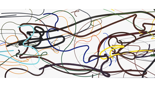Geboren 1920 in Louny/Böhmen, wo er 2011 auch starb, war er nicht nur als Maler sondern auch als Mathematiker ausgebildet. Ab Anfang der 60er Jahre hatte er Zugang zu einem der ersten Computer in der Tschechoslowakei. Er orientiert sich mit seinen bogenförmigen Linien zunächst an einem Koordinatenraster, das als Einzeichnung auf der Leinwand sichtbar bleibt, entwickelt dann aber ganz unterschiedliche Verfahren und Regeln zur Malerei. In der Ausstellung tritt der theoretische Teil gegenüber den ästhetischen Formlösungen und den wechselnden Temperierungen der Gemälde in den Hintergrund. So schlingen sichFarbbündel im dynamischen Fluss umeinander. Oder eine Spirale wechselt allmählich ihren Farbton. Oder von einem festgelegten Punkt aus schlängeln sich Linien in unterschiedlicher Dicke, Farbigkeit und Verlauf in verschiedene Richtungen.Vor allem im frühen Werk kräuseln sich die Linienstücke sparsam auf der weißen Fläche; später werden die Bilder lebhaft, breite Buntfarben überwuchern den Grund.