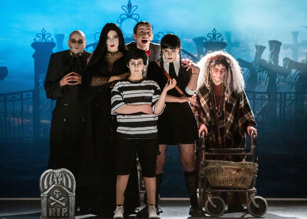 Das Stück beginnt mit einem eiskalten Händchen, welches sich nach einigen musikalisch untermalten „Kapriolen“ zwischen den beiden Vorhanghälften zurückzieht. Als sich dieser dann öffnet, staunen wir erstmal über das Bühnenbild von Jan Bauerdick und Benedikt Fiebig, die uns mit stimmungsvollen Prospekten auf den liebsten Aufenthaltsort der Addams, den Friedhof, entführen. Dort gibt sich die morbid-skurille Familie ein Stelldichein – eingekleidet in den phantasievollen Kostümen von Noelle-Magali Wörheide. Der alltägliche Horror um das dem Unglücklichsein frönende Ehepaar Morticia (Anja Bielefeld) und Gomez (Leon Gleser), ihren sadistisch veranlagten Kindern Wednesday (Giulia DÁcquisto) und Pugsley (Fiona Röhrig in einer Hosenrolle), dem nur unartikulierte Laute von sich gebenden Butler Lurch (Vassilis Sachinidis), der „Zaubertränke“-mischenden Oma (Saskia Deer) und dem den Mond anheulenden Onkel Fester (Florian Siegmund) kann beginnen, bis er jäh vom Besuch des biederen Ehepaars Mal (Dennis Gottschalk) und Alice (Nina Jestel) unterbrochen wird, in deren Sohn Lucas (Victor Kuhlen) sich Wednesday verliebt hat – und die Grenzen zwischen „normal“ und „verrückt“ immer mehr verschwimmen…