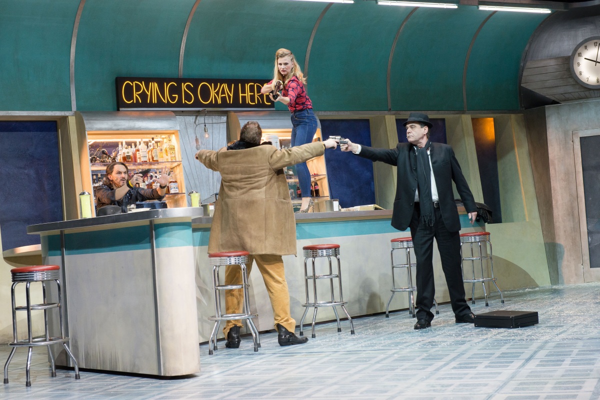 Manchmal, ganz selten, eigentlich fast nie keimt der Wunsch nach einer Zeitmaschine auf, die die gute alte Zeit wiederbringt, als Jimi Hendrix auf Fehmarn oder die WHO in Essen gespielt haben. Eine solche Zeitmaschine ist „After Midnight“, der tiefe Blick in Gläser und Abgründe im Essener Grillo. Dort treffen irgendwo im Nirgendwo mächtige Songs auf wilde Geschichten, natürlich in einer etwas heruntergekommenen Bar (Sorry Suzanne) mitten im amerikanischen „Rust Belt“ zwischen einer Tankstelle und einem Reifenlager. Ivonne Theodora Storm hat dafür ein ziemlich tolles Bühnenbild mit Vorder- und Rückseite gebaut, wo an einem unter Schneemassen erdrückten Silvesterabend der Handlungsreisende Cassius (Jan Pröhl als Johnny Cash) und der alternde Schriftsteller Norman (Jens Winterstein als Leonard Cohen) als scheinbar zufällige Gäste von Inhaberin Pattie (Laura Kiene) aufeinander treffen.