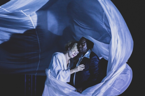 Das eigentliche Desaster bleibt Othello selbst. Anfangs noch amüsiert steigert er sich immer weiter ins Unglück, in höchster Wut tobt er in seiner nigerianischen Heimatsprache. Das hat natürlich Gründe: Die gute Seele, der reine Geist ist zu naiv im Glauben Freunde zu haben und in einer freundlichen Welt zu leben. Eigentlich treibt er sich selbst zum Mord, fängt an die Liebe zu hinterfragen, das „Warum ich?“, wo es doch so viele andere gäbe. Der Außenseiter durch Hautfarbe bemerkt die größer werdende Masse an Neidern nicht. Im Traum verliert er die untreue Gattin und den Weltmeistergürtel an den dauergelangweilten Cassio. Am Ende wird er sie mit einem hereinwehenden Seidenvorhang ersticken, um dann die Wahrheit von Emilia zu erfahren. Die wird dann wegen ihres Verrats auch noch gemeuchelt und so hängen die Frauen still und tot über dem roten Sofa, wie es sich im Geschlechterkampf gehört. Viel ist bei einer solchen Fokussierung vom Shakespeare natürlich auf der Strecke geblieben, über ein Dutzend Rollen und etwas vom dramatischen Flair in der Sprache. Hier kann man das locker verschmerzen.