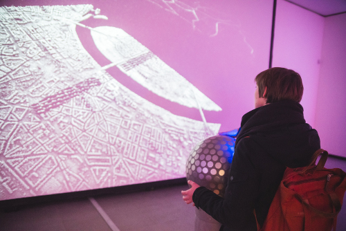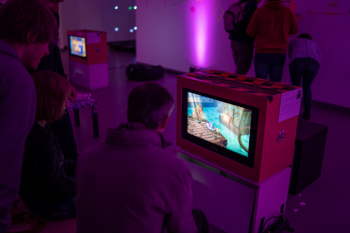Dass zahlreiche Exponate und Präsentationen zum Anfassen und Mitspielen einluden, lag in der Natur der Sache. Besonders spektakulär war etwa die Installation „Ghosted Views“ des niederländischen Medienkünstlers Marnix de Njis geraten: Mit einer Art Kristallkugel als Controller konnten die Besucher durch einen 3D-Laserscan der Düsseldorfer Innenstadt manövrieren, überlebensgroß auf eine Wand projiziert. Der von Sebastian Quack zusammengestellte Spieleparcours „Kein leichtes Spiel / Uneasy Game“ widmete sich hingegen der Frustrationsgrenze: Die hier vertretenen Spiele legten es darauf an, die Spieler zu verwirren und an ihren Nerven zu sägen, wie etwa eine digitale Sisyphos-Variante, in der sich eine in einem Kessel sitzende Figur allein mit einem Hammer als Hilfsmittel einen Berg hochwuchten muss. Für „Let's build a spaceship“ hatten Jugendliche eine Raumschiffbrücke à la Star Trek gebaut, auf der man eine mehrköpfige Besatzung brauchte, um durchs All zu navigieren. An weiteren Spielestationen konnten Spiele von hoffnungsvollen Nachwuchs-Game Designern unter 25 Jahren angetestet werden, die mit dem Mulitmediapreis mb21 ausgezeichnet worden waren. Daneben zeigte etwa der Escape Room „Project Curie“, dass man nicht unbedingt einen Computer braucht, um Spielprinzipien umzusetzen.