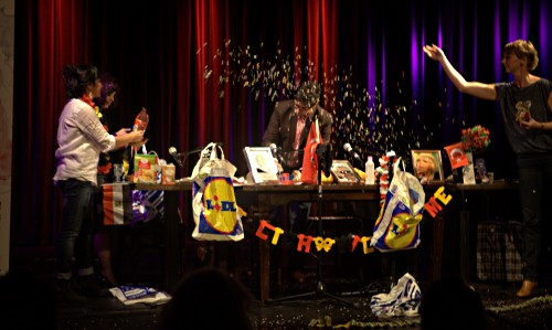 Als Lesebühne fungierte im Katakomben-Theater ein mit Nationalflaggen, Discounter-Plastiktüten und Alkoholika gespickter Tisch. Als Intro lief „10 Jahre hier“ von Malek Samo, ein satirischer Abgesang auf die Aufenthaltspolitik hierzulande. Nach 08/15-Begrüßung, inklusive einiger Witze über die Austragungsstadt Essen, ging es dann auch direkt in die Vollen.