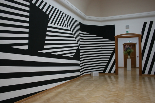 „Size Matters I“ heißt die Präsentation, die kein Spektakulum braucht um Positionen festzuschreiben. „Du bist so schön, wenn Du traurig bist.“ Ein Satz, den die Künstlerin in Schreibschrift in zartem Rosa und in endlosen Reihen auf die Wand eines Raumes gepinselt hat, und so nicht nur die Atmosphäre, sondern auch die Denkstrukturen im sonst leeren Zimmer verändert. Das ist keine feministische Parole, das ist ein lyrisches Statement. Während man die Schrift entziffert, tönt es bereits aus dem Nebenraum, wo Brogan auch die Wände mit schwarzweißer Streifigkeit überzogen hat. Dazzle Design nennt sich das, ja, in Räumen hat das was von Daniel Buren, aber die vier Lautsprecherboxen liefern dazu eine permanente Soundspur mit Texten der Künstlerin. „Simply the belief that women should be as free as man.“ Im nächsten Jahr sollen die Installationen bei „Size Matters II“ noch größer werden.