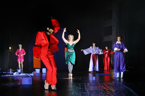 Wissert lässt sieben Darsteller:innen den Text vortragen, weniger chorisch und klagend, sondern exakt und emotionslos, womit sich Ernaux‘ Prosa zwar in diesem Stimmengeflecht auflöst, die Bühnenadaption jedoch an ihren Sätzen klammert. Oft formieren sich die Darsteller:innen zu einer Gruppe, als verhandelten sie eine kollektive Erfahrung. Alle stecken in grellfarbener Kleidung (Kostüme: Mascha Mihoa Bischoff), mit der sie die feinen Unterschiede signalisieren, durch die sich diese bourgeoise Bohemiens von der funktionalen Alltagsgarderobe abgrenzen, die sich wiederum der von Ernaux porträtierte, proletarische Vater überstreift.