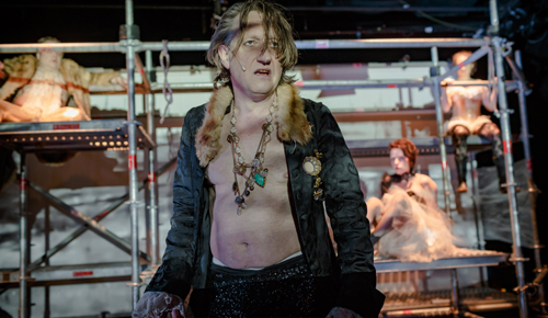Nach dem aristokratischen Golgatha Berg für die Moerser Kunstfigur „Elder Statesman“ – ich hoffe mal nicht, dass da auch Ämter-Protagonisten der Heiligen der Letzten Tage Pate gestanden haben – kommt bei Gabriel das Büchner-Intro mit Neil-Young-Riffs aus „Dead Man“. Cowboystiefel sind in den Kostümen vorhanden, nur die Langeweile macht alle fertig. Da hilft auch kein Büchner-Märchen aus „Woyzeck“ mehr, der Hafen ist umgestürzt im Königreiche Popo: „Mein Leben gähnt mich an wie ein großer weißer Bogen Papier, den ich vollschreiben soll, aber ich bringe keinen Buchstaben heraus.“ Prinz Leonce (Matthias Heße zum Wegschreien in hautenger Goldhose mit Pelzmantel) soll nun Prinzessin Lena (Marissa Möller) heiraten, ein Aufruhr tritt in sein Leben, selbst der treue aber eigentlich latent arbeitsscheue Diener Valerio (Patrick Dollas) rät zur Flucht. Doch wie? Das Schloss, das Königreich ist ein einziger Überwachungsstaat. Anna Marienfeld, Tilman Oesterreich, Björn Nienhuys filmen was die Kamera hergibt, Schaukelpferde hinter der Bühne, aufreizende Szenen, die geheimen Wünsche und Gespräche der Protagonisten. Kein Wunder, dass sich hier der Frust in Wunschdenken manifestiert und dennoch, eine Flucht gibt es nicht, durfte man bei Büchner noch ins Dolce Vita Italien, drücken sich hier die kommenden Paare mehr im Schlossgraben herum. Statt Pleasure-Dome erstmal nur Drugs ohne (naja, irgendwie schon) Sex, aber mit Martin-Luther-King-Zitaten. Rock und Roll ist sowieso immer anwesend.