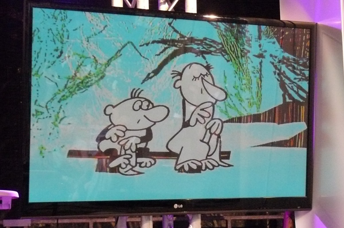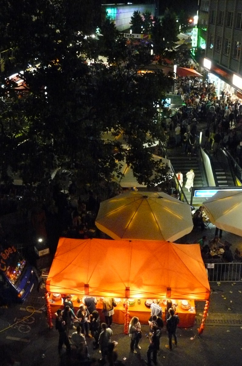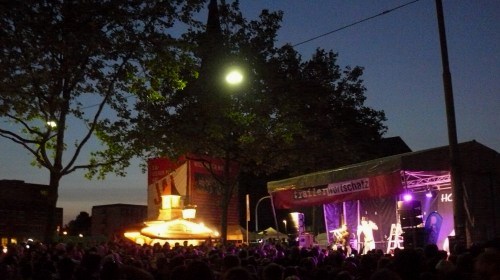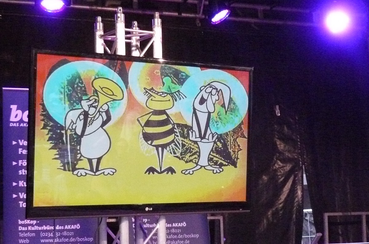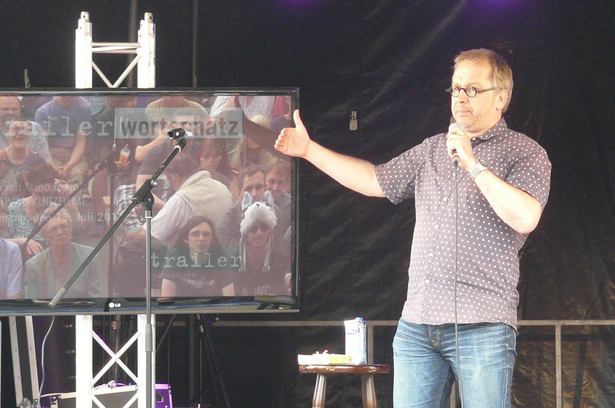 Und dann gab es ja noch eine Premiere. Nach den Auftritten von Ben Redelings, Fred Ape und Matthias Reuter wurde den Wartenden die Zeit mit Kurzfilmen des Blicke-Festivals versüßt. Zwar behinderte die dem guten Wetter geschuldete Spiegelung des Bildschirms die Sicht ein wenig, doch blieb so mancher vorbeiziehende Festival-Besucher fasziniert stehen und folgte aufmerksam der ungewohnten Bühnenaufführung. Fazit: Ausdrucksstarke Bilder als ideale Ergänzung einer Bühne, bei der sich sonst alles um das Wort dreht.