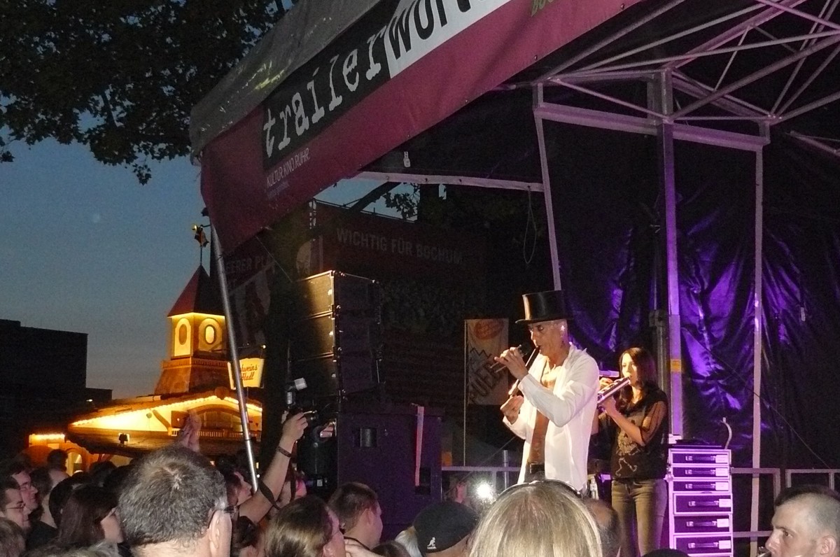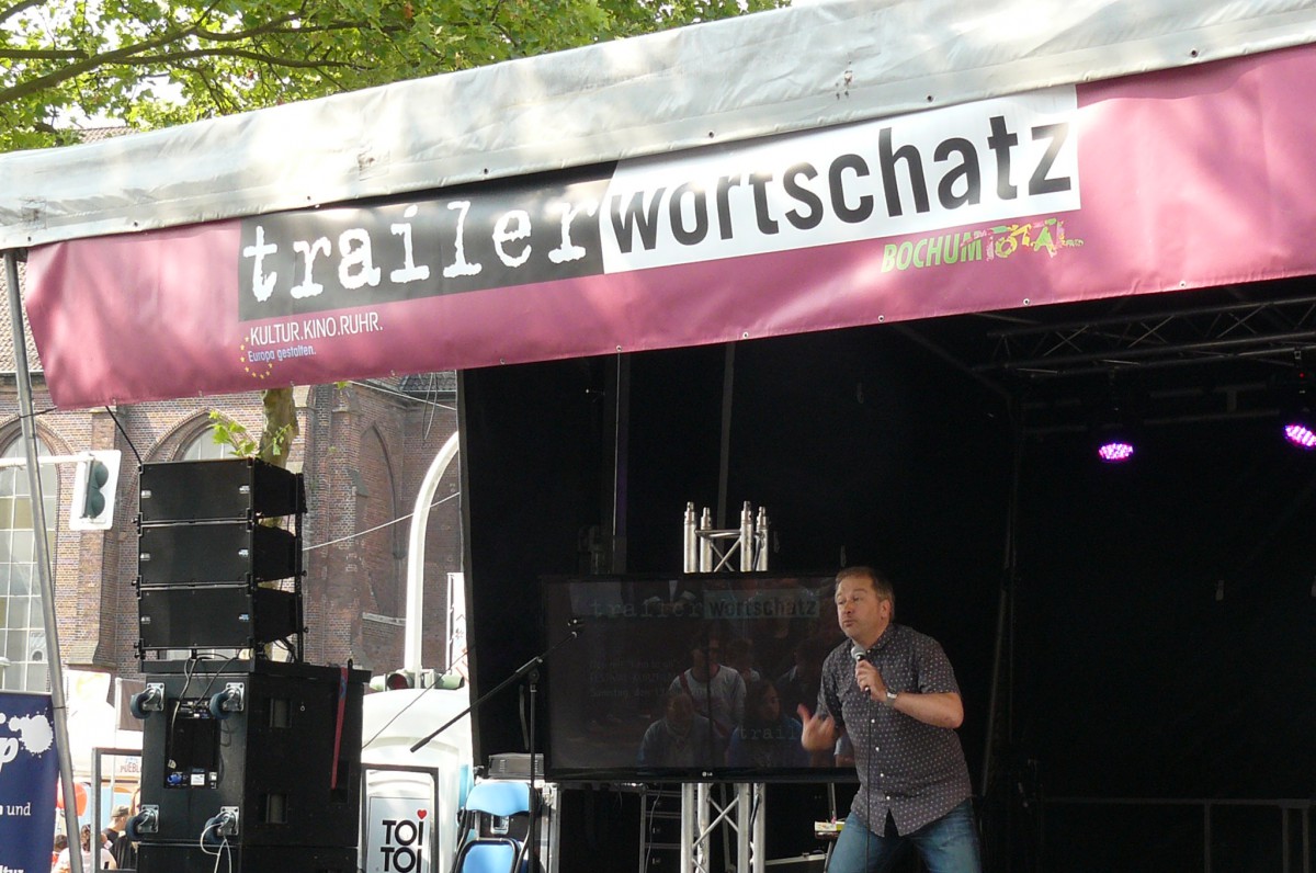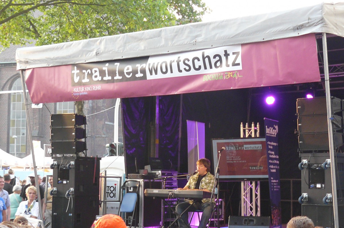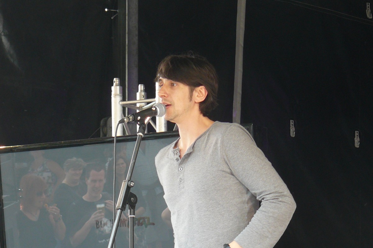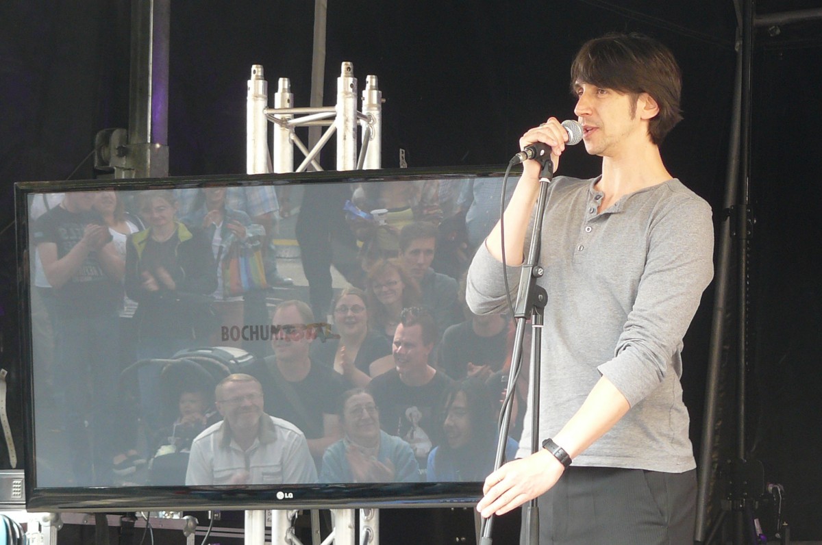 Der Wettergott meinte es in diesem Jahr gut mit Bochum Total. Keine orkanartigen Regenschauer und keine Temperaturen, die im Massenbetrieb zum Hitzeschlag führen. Stattdessen mildes Sommerklima, das zum Verweilen einlud. Schon zur Mittagszeit füllte sich der Platz vor der trailer-wortschatzbühne mit Menschen, die versuchten, den rasend-schnellen Wortkaskaden des erprobten Poetry-Slammers und Bühnenpoeten Marco Jonas Jahn zu lauschen. Abwechselnd versorgte er die Zuhörerschaft mit gedichteter Wortakrobatik und Kurzgeschichten aus der eigenen Biografie. So sorgten die Kindheitserfahrungen mit den Bundesjugendspielen ebenso für breites Schmunzeln wie seine Bonitätsempfehlung für die Ratingagenturen dieser Welt. LmaA (Leckt mich am Arsch) gab es statt der Bestnote AAA für Moody‘s, Fitch und co. Dass er es politisch kann und dies mit raffinierten Wortspielen zu verbinden versteht, zeigte Jahn auch seinen Überlegungen für das eigene Sparpaket. Durch Weglassen von zunächst Artikeln und dann Vokalen kam am Ende nur noch ein unverständliches Kauderwelsch heraus. Manchmal ist mehr eben doch mehr.