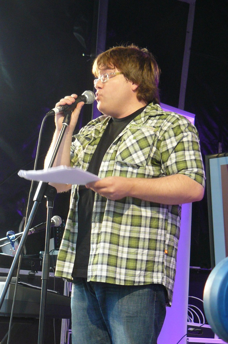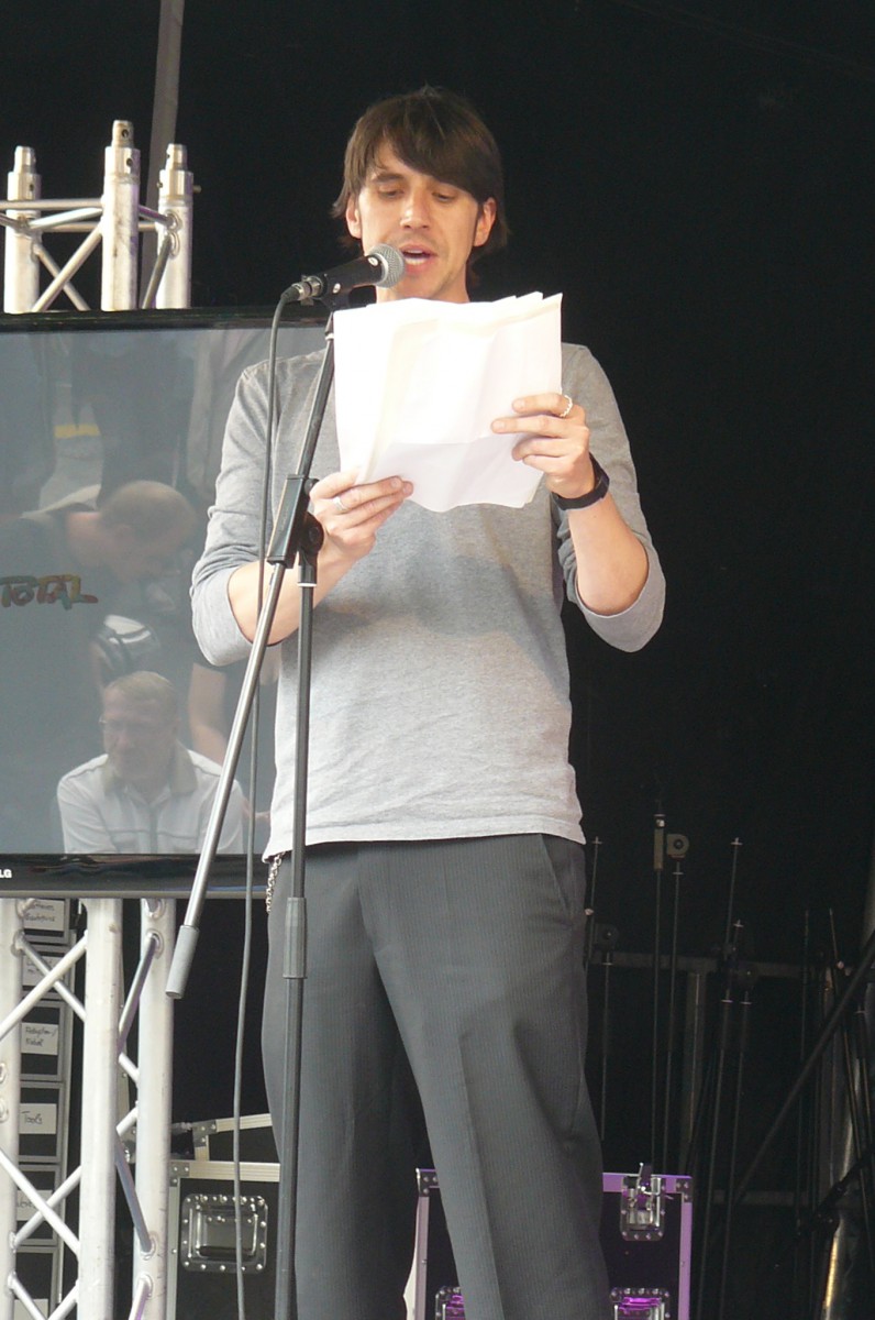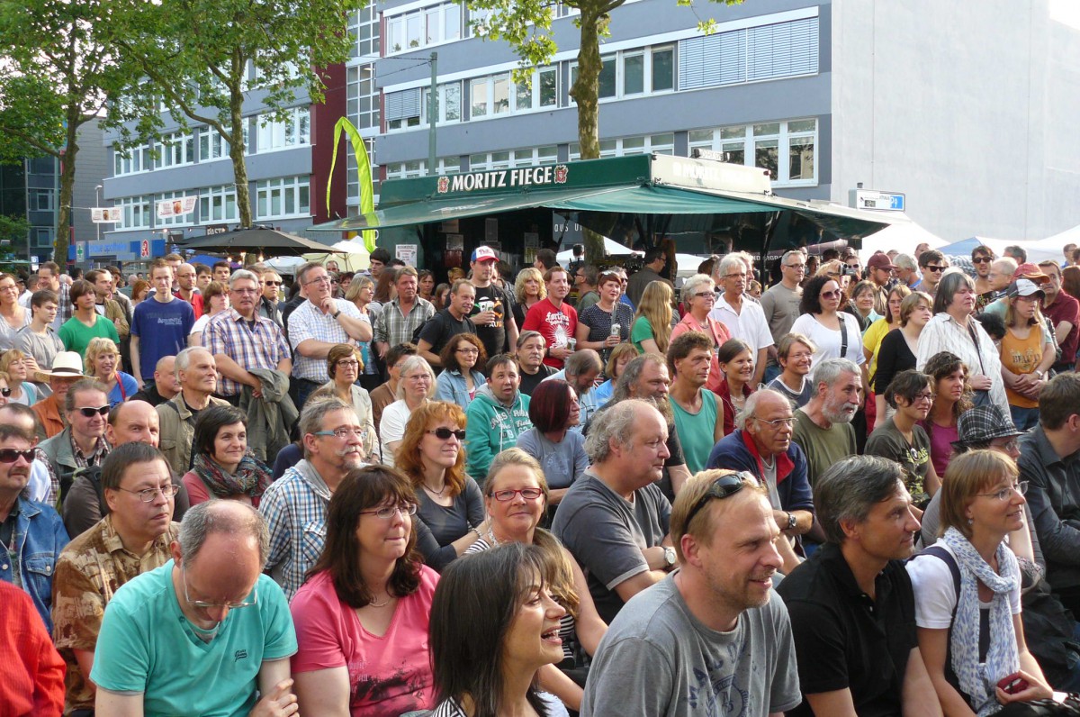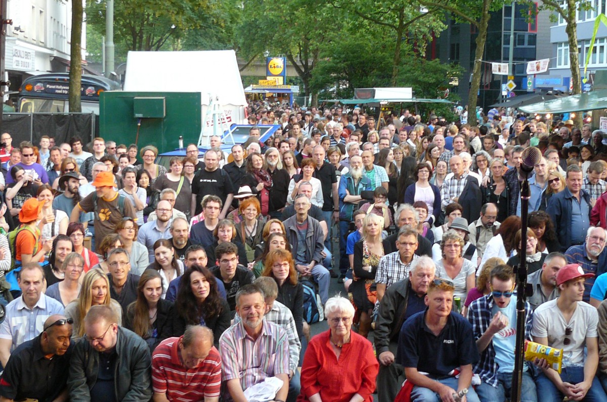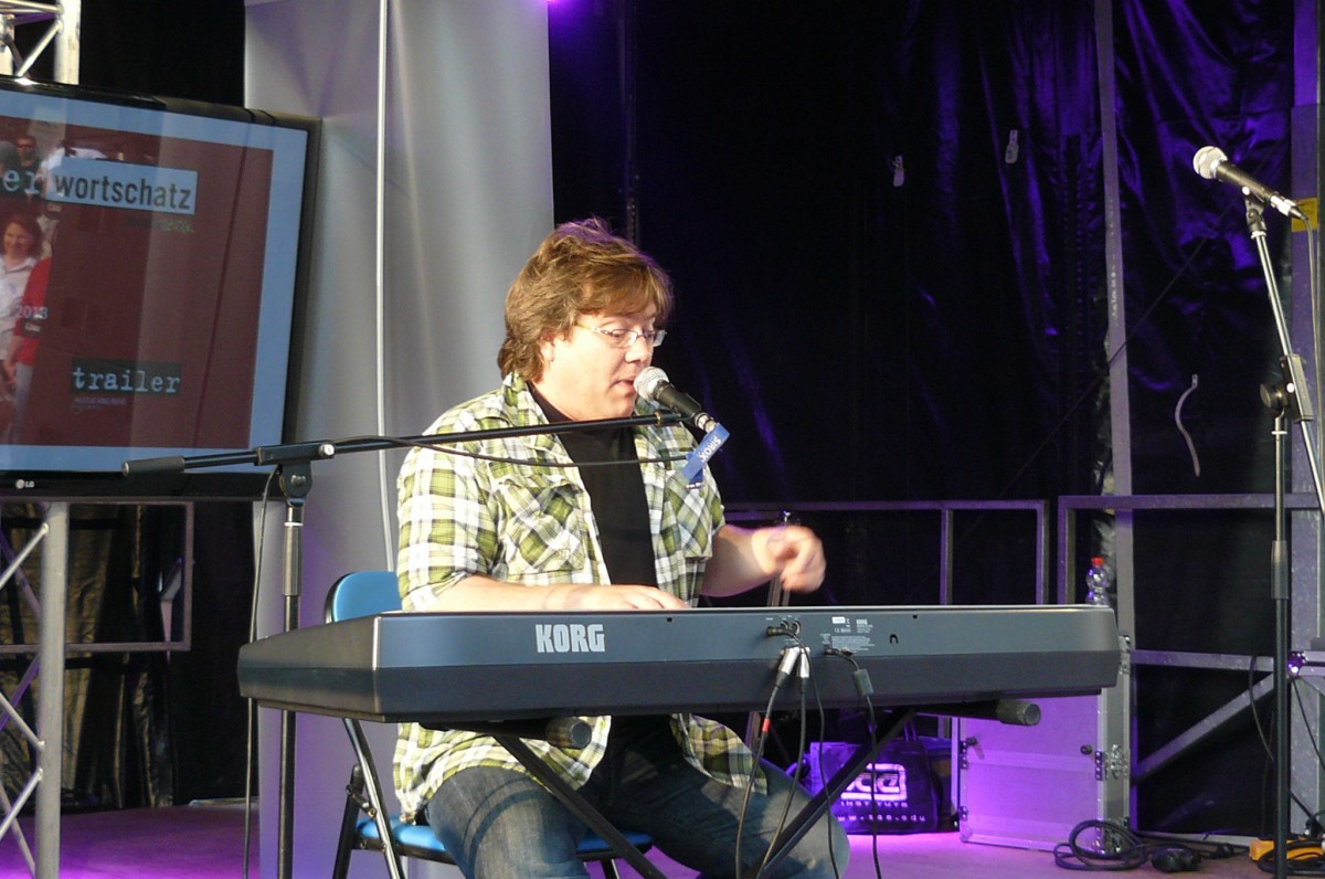 Der Wettergott meinte es in diesem Jahr gut mit Bochum Total. Keine orkanartigen Regenschauer und keine Temperaturen, die im Massenbetrieb zum Hitzeschlag führen. Stattdessen mildes Sommerklima, das zum Verweilen einlud. Schon zur Mittagszeit füllte sich der Platz vor der trailer-wortschatzbühne mit Menschen, die versuchten, den rasend-schnellen Wortkaskaden des erprobten Poetry-Slammers und Bühnenpoeten Marco Jonas Jahn zu lauschen. Abwechselnd versorgte er die Zuhörerschaft mit gedichteter Wortakrobatik und Kurzgeschichten aus der eigenen Biografie. So sorgten die Kindheitserfahrungen mit den Bundesjugendspielen ebenso für breites Schmunzeln wie seine Bonitätsempfehlung für die Ratingagenturen dieser Welt. LmaA (Leckt mich am Arsch) gab es statt der Bestnote AAA für Moody‘s, Fitch und co. Dass er es politisch kann und dies mit raffinierten Wortspielen zu verbinden versteht, zeigte Jahn auch seinen Überlegungen für das eigene Sparpaket. Durch Weglassen von zunächst Artikeln und dann Vokalen kam am Ende nur noch ein unverständliches Kauderwelsch heraus. Manchmal ist mehr eben doch mehr.