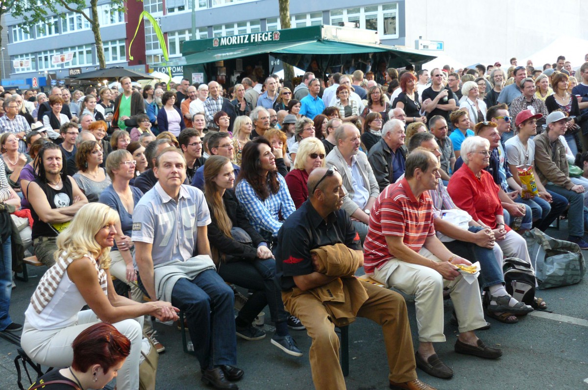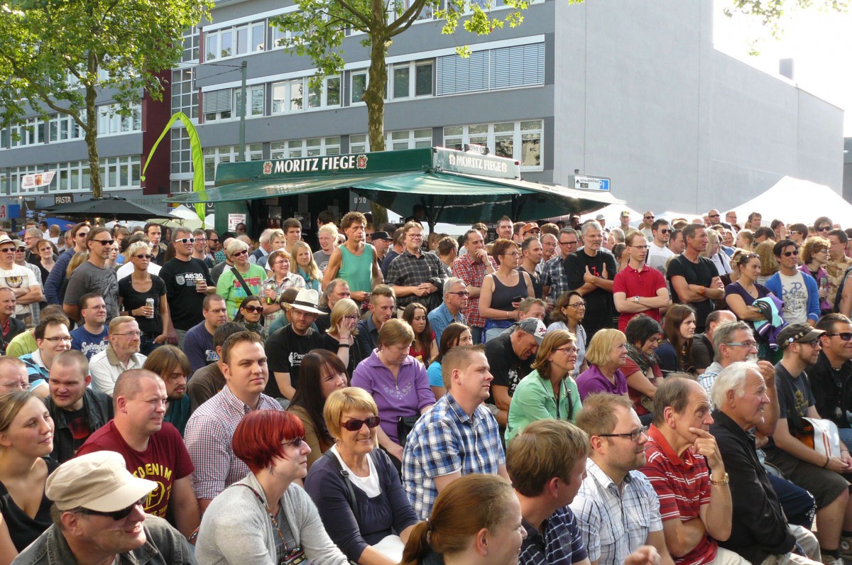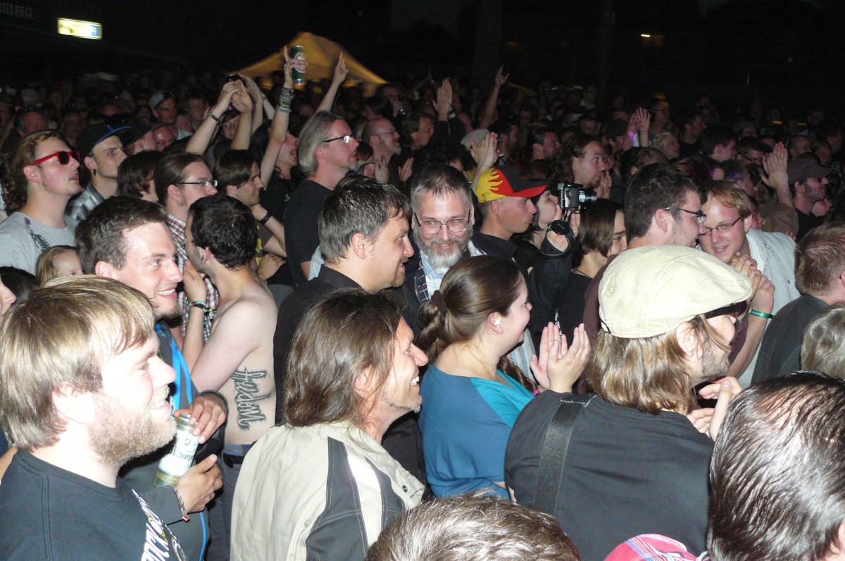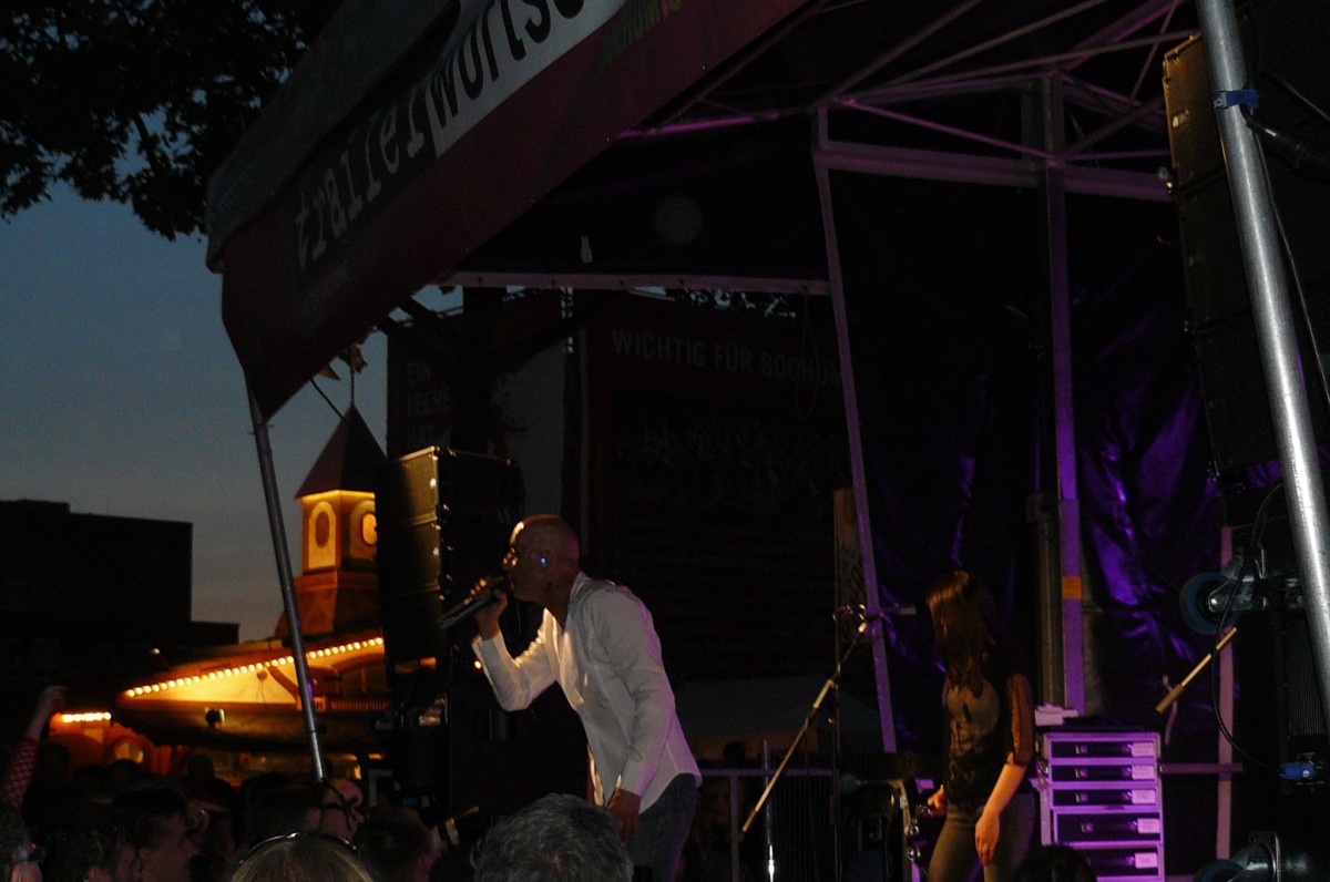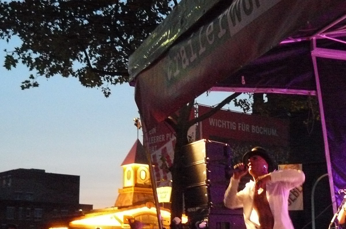In guter alter Liedermacher-Manier eroberte im Anschluss der Dortmunder Poet und Entertainer Fred Ape die „hearts and minds“ des gut-aufgelegten Bochumer Publikums. Nur mit der Akustik-Gitarre und der eigenen Stimme ausgestattet übertönte er spielend die wummernden Bässe der anderen Bühnen im Hintergrund. Musikalisch an Hannes Wader und Konsorten erinnernd, zeugten Apes Texte von abgründigem Humor, böser Ironie und feinem Sarkasmus. Die eigenen Alltagsbelastungen als Vater einer erwachsen werdenden Tochter wurden ebenso vertont wie die beschränkte Lernfähigkeit des Menschen in Sachen Vorurteilsüberwindung. Der politischen Klasse wurde mit „Politikwissenschaft“ ein eigener Song gewidmet und dem Ruhrgebiet gleich deren zwei. Das eine witzig-selbstbewusst („Hör zu, Bayer!“), das andere melancholisch-wehmütig.