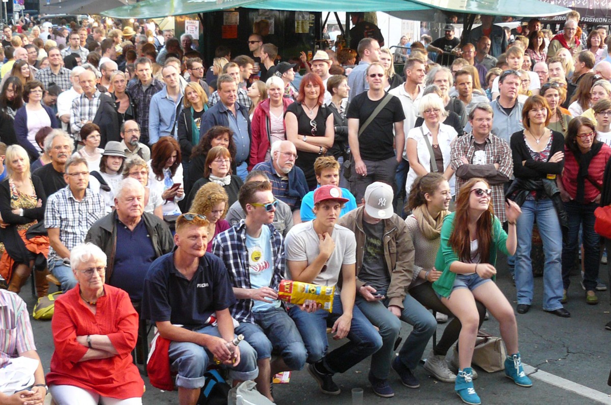 Weniger wortgewandt, dafür aber noch viel bissiger wurde es mit dem nächsten Auftritt des Kölner Kabarettisten Robert Griess. Der Bühnen-Vollprofi zeigte eindrucksvoll, dass er es versteht, eine Meute aufzuwiegeln und dabei auch noch bestens zu unterhalten. Reihenweise ließ er Politiker verbal über die Klinge springen, indem er sie mit deren eigenen – oft grenzdebilen – Worten zitierte. Ob Ursula von der Leyen, Karl-Theodor („ab und zu“) Guttenberg oder Verteidigungsminister Thomas „die Misere“, jeder, der es verdiente, bekam sein Fett weg. Die Finanzwirtschaft kam insgesamt nicht gut weg an diesem Tag. Wie schon zuvor Marco Jonas Jahn und nach ihm Fred Ape ließ auch Robert Griess kein gutes Haar an Bankern und Gesinnungsgenossen in der Politik, indem er feststellte, dass sich „Schwarz-Gelb und Schwarzgeld“ nur durch einen Buchstaben unterschieden. In seinem provokant-pointierten Auftritt als Kölner Unterschichts-Proll legte er dann jegliche verbale Zurückhaltung ab und ließ eine sehr kritische „Volkes Stimme“ zu Wort kommen. Privates und öffentliches Trash-TV bekam ebenso sein Fett weg wie die neue Bioladen-Dekadenz der oberen urbanen Mittschicht. Das Publikum johlte, die von Griess geplante Revolte der Massen blieb allerdings vorerst noch aus.