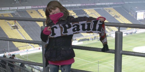 „Sach mal, haste die Kleene nich‘ in Griff?“ wollte der leicht angetrunkene Riese von mir wissen. Gern hätte ich ihm meine Gedanken von repressionsfreiem Umgang mit Kindern, von Förderung selbstständigem Denkens und Handelns mitgeteilt. Die nackten massig tätowierten massigen Oberarme meines Gegenübers hielten mich ab. „Meine Tochter hat so ein großes Herz, die muss immer zu den Schwächeren halten.“ Der brummige schwarze Bär mit gelben Streifen zog daraufhin friedlich ab. Der BVB gewann an jenem Nachmittag 2:0 und verlor meine Tochter als mögliche Anhängerin. Sie ist nun überzeugter St-Pauli-Fan. Es gibt schlimmeres.