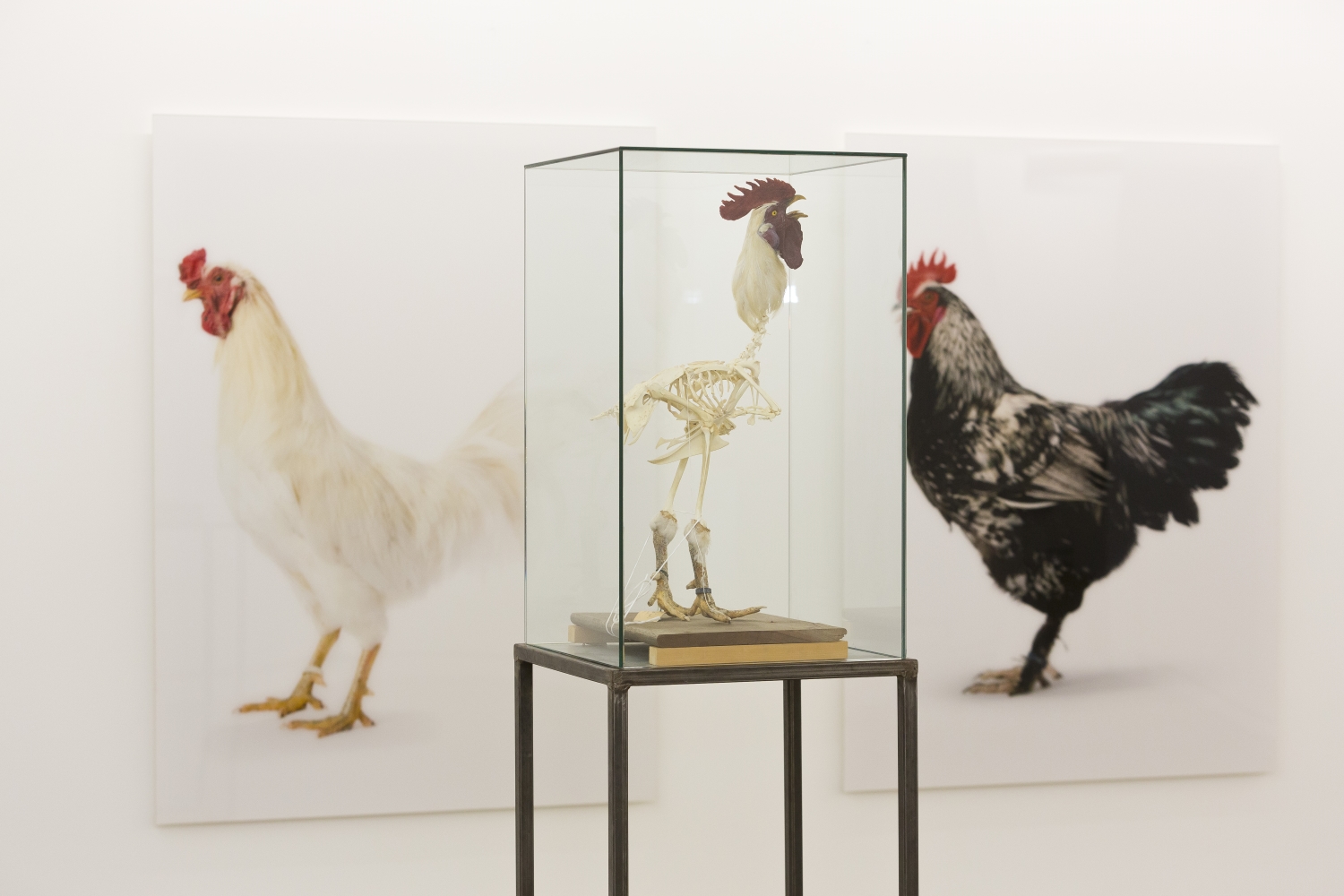 Neben der Ästhetik der Vergänglichkeit sind wissenschaftliche Reflexionen eine weitere Gemeinsamkeit – und mitunter erklärungsbedürftig. Hühnerfotos und das Präparat eines halb skelettierten Hahns von Koen Vanmechelen lassen nicht erahnen, dass es sich hier um die Dokumentation eines Zuchtprojekts mit dem Ziel handelt, ein globales Huhn aus den Genen aller Rassen zu erschaffen. Panamarenko konstruiert fantastische, völlig untaugliche Fahrzeuge. Jan Fabre und Ilya Kabakov kostümieren sich für ein Video als ihre Alter Egos „Käfer“ und „Fliege“, Berlinde de Bruyckere wirft einer stehenden Frauenfigur alte Teppiche über den Kopf. Existenziell packend, befremdlich und belustigend zugleich.