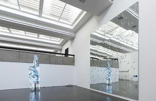 Astrid Klein, die zweifelsohne die Wiederentdeckung der Ausstellung ist, ist mit ihren Neon-Spiegel-Objekten ebenso vertreten wie Reinhard Mucha mit legendären frühen Arbeiten. Wirklich eine Neuentdeckung ist Aron Mehzion mit seinen im Kupfer reflektierten Passagen. Lili Dujourie wird von ihrer stärksten Seite gezeigt, also nicht nur mit den für sie typischen Spiegelarbeiten, sondern auch mit Bodenplastiken aus Metall, denen das Motiv der Spiegelung zugrunde liegt. Lediglich indirekt hat das Tableau digitaler Fotografien von Rosemarie Trockel mit dem Thema zu tun, dann identifiziert man aber die Selbstporträts und entdeckt schließlich das (aus einem aufgeschlagenen Buch abfotografierte) Porträt von Mario Merz, der selbst mit Neonröhren gearbeitet hat: Es hängt exakt gegenüber den Neon-Ketten von Astrid Klein.