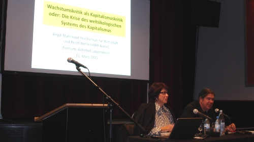 Anders als Konsumkritiker wie Niko Paech, die einen drastischen Konsumverzicht, mithin eine Umstellung auf urbane Selbstversorgung als Ausweg predigen, sieht die „Öko-Marxistin“ (so Moderator und Veranstalter Uwe Vorberg) in einem anderen Konsumverhalten keine wirkliche Lösung: „Verbraucherverhalten ist ja schön und gut, aber was bringt das?“ Letztendlich sei es nur ein Perspektivenwechsel, denn der Konsument arbeitet mit: Wie wird der Profit realisiert? Zwar müsse der Ressourcenverbrauch wie auch der Konsum drastisch zurückgefahren werden (konkret auf das Niveau der 1950er bis 70er), jedoch handele es sich letztendlich um eine „globale Verwertungs-, eine Überakkumulationskrise.“ Vor dem Hintergrund dieser strukturellen Krise könne, wie die Ökonomin mehrfach betont, „die Verteilungs- und Eigentumsfrage nicht ausgeblendet werden.“ Und es könnte eine bessere Stimmung im Publikum herrschen, wenn Mahnkopf prophezeit: „Es wird eine Veränderung geben und die wird gewaltsam sein. Die Aussage ist: ,Wir haben noch 20 Jahre'“. Immerhin: nicht umsonst spricht sie dabei besonders die jungen ZuhörerInnen im Saal an.