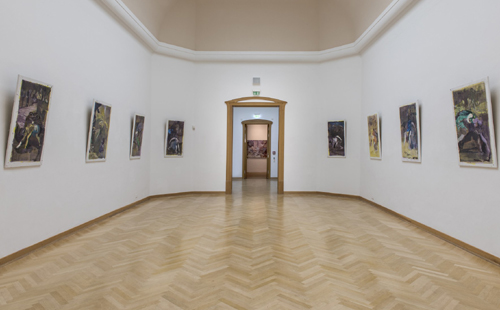 Maki Na Kamura trägt die Ölfarbe mit viel Wasser auf und erzeugt so einen schwebenden Charakter. Mitunter liegt ein rinnender Schleier aus Farbe über dem Geschehen. Aus der Tiefe der transparenten Flächen kommt ein Licht, welches das Geschehen weiter der Realität enthebt. Gegen das Ortlose setzt Maki Na Kamura einzelne Linien, formale Verdichtungen, die in den Bildserien jeweils analog angelegt sind. Tatsächlich bildet in ihren jüngeren Serien oft ein Meisterwerk der Kunstgeschichte den Ausgangspunkt. Eine weiche blaue Form im Mittelgrund repräsentiert, entnommen einer Studie von Puvis de Chavannes, ein Gewässer, konkreter einen „See“, so auch der Titel dieser Werkgruppe von 2016. Eine gebogen verlaufende Vertikale in der Bildmitte bezeichnet einen Baum; nun aber wird er zum trennenden Element. Markus Lüpertz hat ähnlich Paraphrasen zur Kunstgeschichte entwickelt, die aber doch ganz anders sind – er gehört zu den wichtigen Künstlern für Naki Ma Kamura, die vor zwei Jahrzehnten von Osaka nach Deutschland gekommen ist. Ein anderer ist Jörg Immendorff, bei dem sie an der Düsseldorfer Kunstakademie studiert hat. Erst nach ihrem Umzug nach Berlin trat sie mit größeren Ausstellungen in Erscheinung, wurde dort auch mit dem Falkenrot Preis ausgezeichnet. Die Ausstellung in Hagen aber ist ihre erste in einem deutschen Museum.