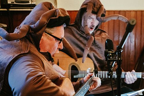Wobei das Gitarrenduo Deux Swing Dada einen anderen Eindruck vermittelt. Vor Beginn der Veranstaltung sitzen Volker Wendland und Gregor Hengesbach konzentriert an ihren Gitarren und stimmen und proben und scheinen unantastbar. Dann spielen sie – und verziehen keine Miene. Profis! Hier sind musikalische Virtuosität und ernste Allegorien auf den Zustand unserer Gesellschaft zu erleben. Dann krabbeln die beiden Männer in Kakerlakenkostümen durch den Saal. Und sie spielen Mozarts 40. Sinfonie in fünffacher Lichtgeschwindigkeit, geben zwischendrin eine Fahrstuhlmusikversion von „Black Hole Sun“ zum Besten geben und die Star-Trek-Melodie als Interludium. Sie lachen nicht. Ein Teil des Publikums dafür umso lauter.
