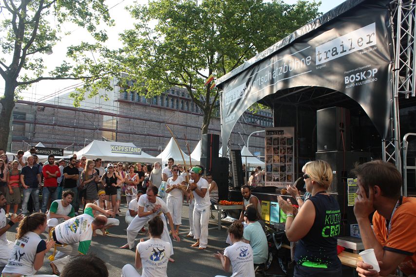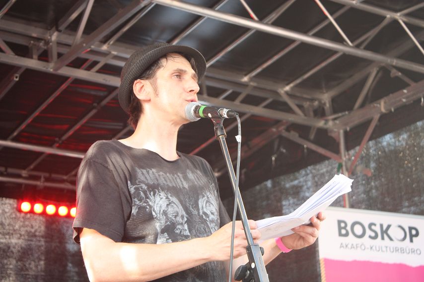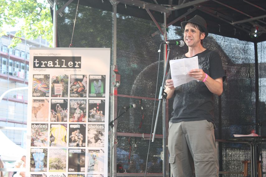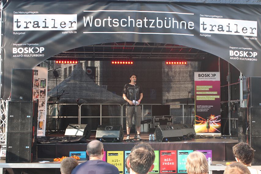Nach einer spontan geplanten Capoeira-Einlage der Bochumer Gruppe Biriba Brasil in der Umbaupause schritt kein Geringerer als Dauerbrenner Marco Jonas Jahn auf die trailer-Wortschatzbühne. Der sympathische Mönchengladbacher, Jahrgang 76, immer noch wie ein Erstsemester-Student wirkend, hatte verlässlicher Weise eine Handvoll Texte parat. Ein Liebesgedicht für Dixi-Klos eröffnete den Reigen, ein Abgesang auf Zeigefinger und lehrerhaftes Verhalten der Marke „das lernst du auch noch“ folgte und brachte dem bereits zahlreich anwesenden Publikum den Spaß in die Backen. Der Ernst des Lebens kann Jahn mal gerne haben und doch holt er ihn immer wieder ein: Vor Strafzetteln für das Parken an einem Wendehammer oder Kämpfen aufs Blut mit dem guten alten Laminat sind auch Poeten der ersten Güteklasse nicht gefeit. Fast versöhnlich lies der schwarzhaarige Struwwelpeter seinen Auftritt mit einer Liebeserklärung an seine Partnerin ausklingen. Man kann ihn einfach nur gerne haben.