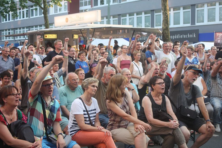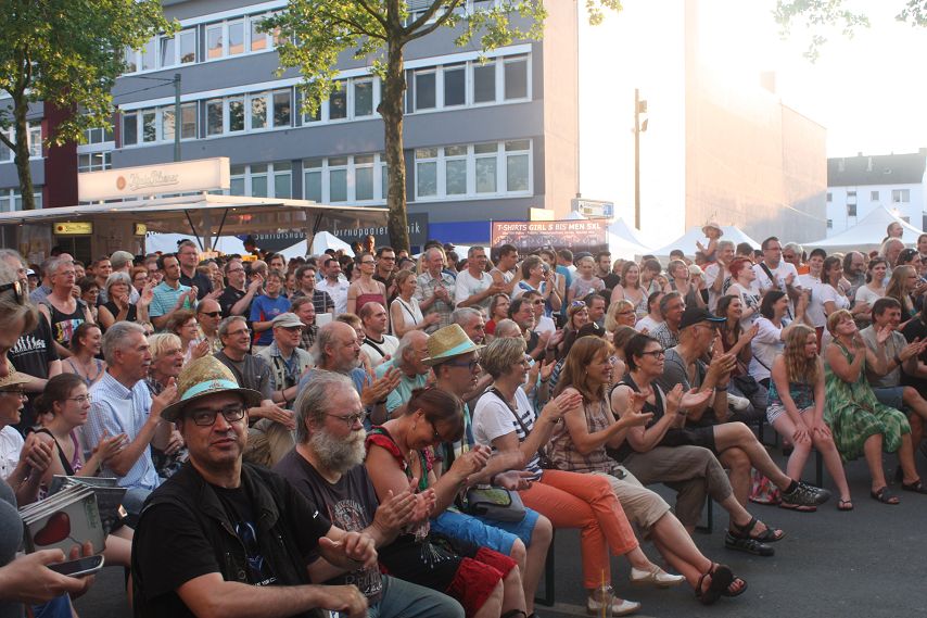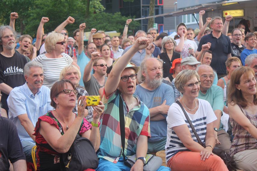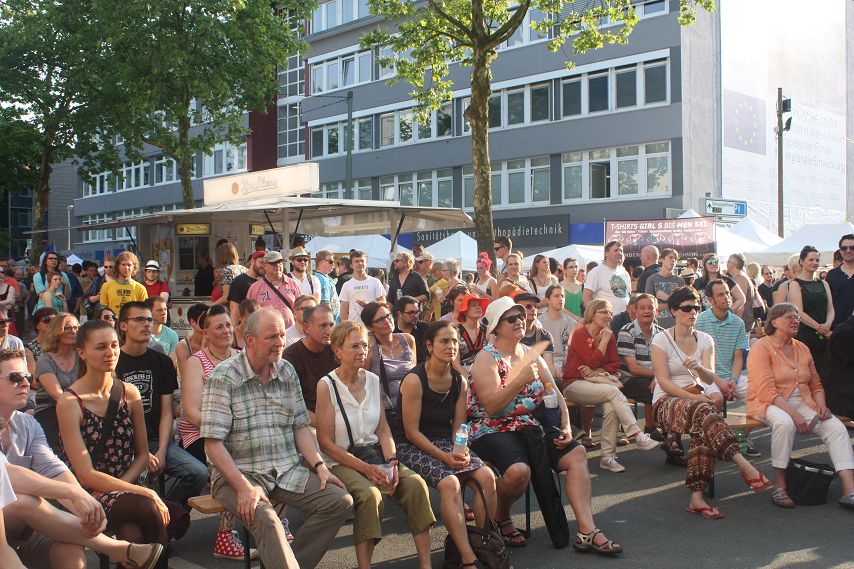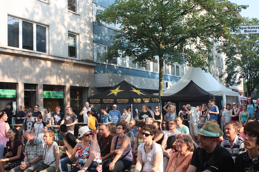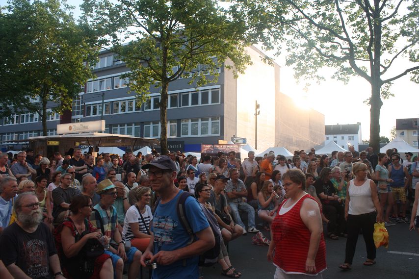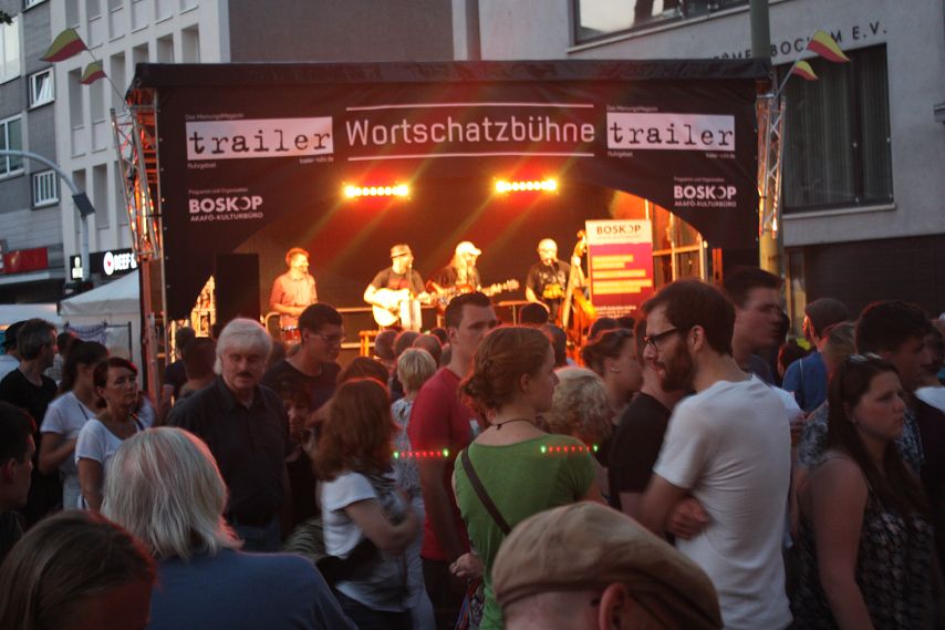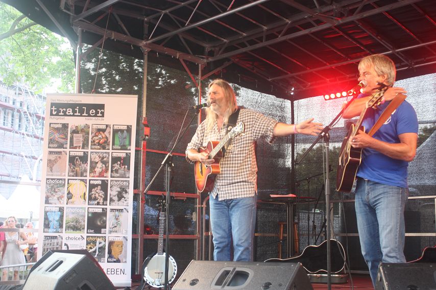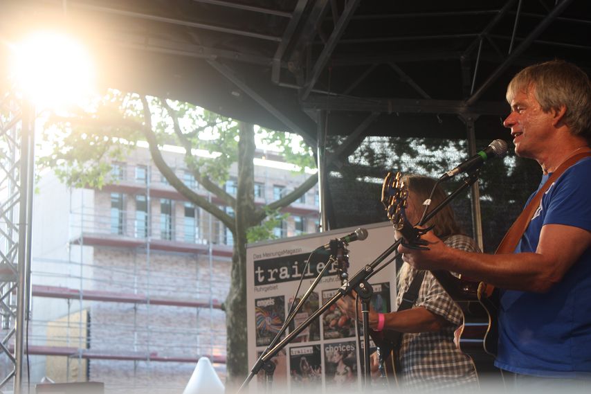 Während der Umbaupause parkten sich schon die ersten Fans auf den rar gesäten Bierbänken, um beim folgenden Auftritt von Ape & Feuerstein einen guten Platz zu haben. Die Auftritte der Meister des politisch-humoristischen Liedes waren bereits in den Vorjahren echte Highlights auf der trailer-Wortschatzbühne und auch am Festival-Freitag sorgten die beiden Herren aus Dortmund wieder für ein Ausrufungszeichen. Lieder wie „Politikwissenschaft“ oder „Hauptsache ist“ sind Klassiker, die der Generation „Ü50-undogmatisch links“ aus dem Herzen sprechen, aber auch junges Publikum begeistern. Auch der zuversichtliche Blick auf das Alter inklusive Ironman-Lauf und Vaterschaft mit 100 Lenzen sorgte als Abschluss für Sympathien bei Jung und Alt. Der straffe Zeitplan war letztlich daran schuld, dass Ape & Feuerstein nach nur 30 Minuten die Bühne verließen. Doch zumindest Feuerstein sollte noch einmal zurückkehren…