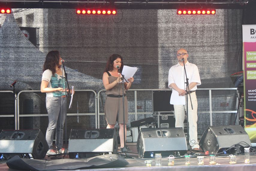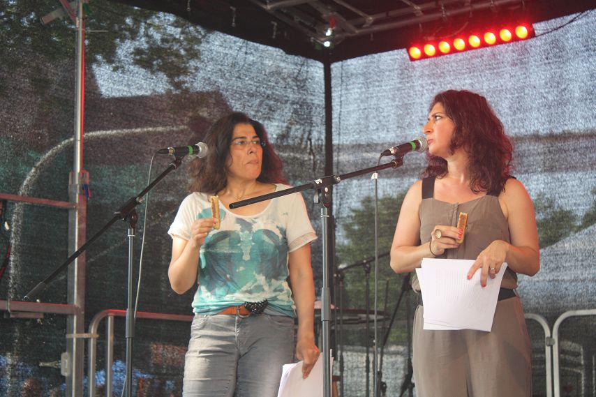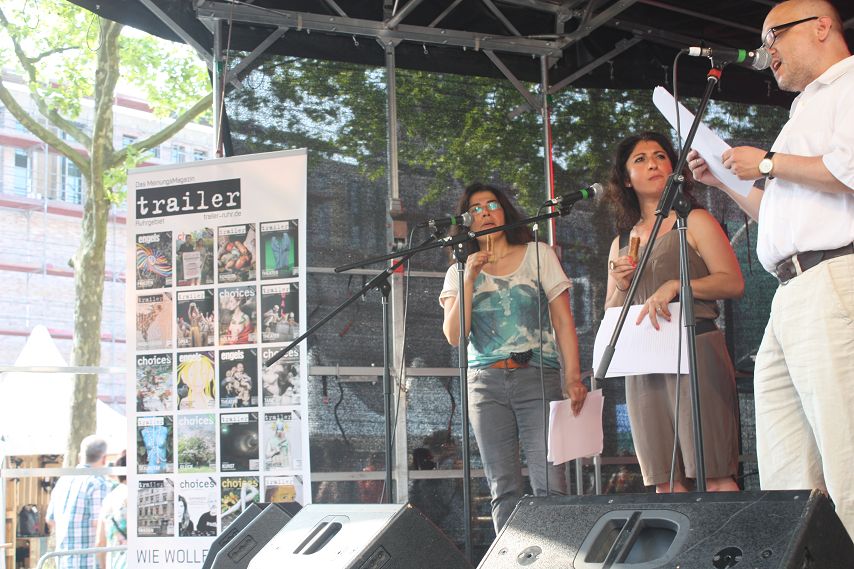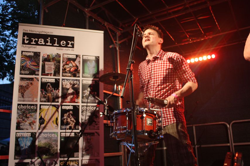 Bochum Total wird in diesem Jahr 30 Jahre alt und passend dazu wartete die trailer-Wortschatzbühne am Festival-Freitag mit einer Art Best-Of-Programm auf. Die Theatergruppe Freie Radikale, das „hybride Theater der Gegenwart“ eröffnete die Bühne pünktlich um 17:45 Uhr. Die zu dritt angereisten Schauspieler boten eine Mixtur aus gesprochenem Wort und minimalen Schauspiel-Elementen. Thematisch ging es in subtiler Art und Weise um den Unsinn von kulturellen Stereotypen und den eigenen Umgang mit Ressentiments. Um mit Vorurteilen endgültig aufzuräumen, bissen die Schauspieler um Şermin Kayık einfach mal in eine Bratwurst und verteilten Antiweltdepressiva, Integrationshemmer und Co. in Form von Bonbons an ihr Publikum. Kommende Woche feiert ihre neueste Produktion „Schaf. Biene. Pferd.“ Premiere in den Rottstr5 Kunsthallen. Diesmal geht es dem Kapitalismus an den Kragen – eine mit Sicherheit ebenso kurzweilig wie tiefsinnige Gesellschaftskritik wie an diesem Freitag. Dann auch sicher mit mehr Bühnenbild und Maske.