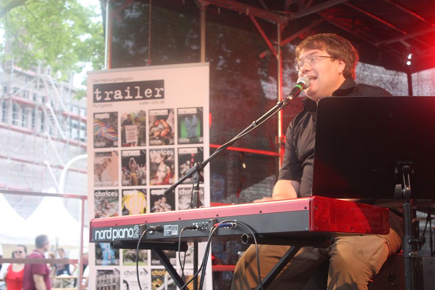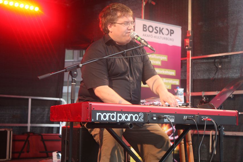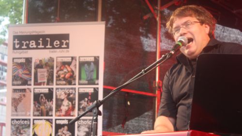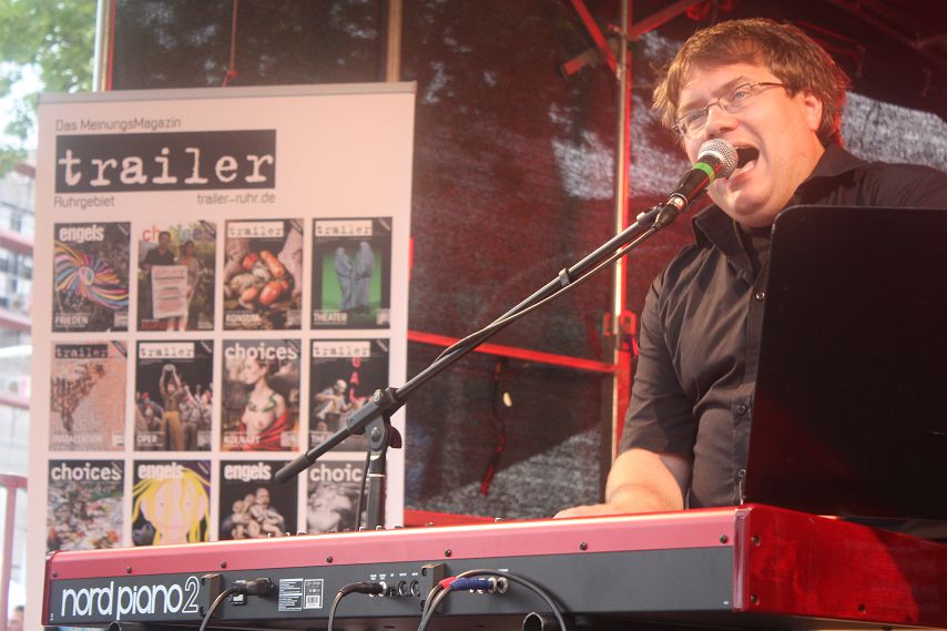 Um 17:45 Uhr bekam es das Publikum dann mit einem altbekannten Highlight in Person von Matthias Reuter zu tun. Der Oberhausener Musik-Kabarettist stand auch an diesem Abend für subtil-politische Klavier-Stücke und wahnwitzige Anekdoten über Alltag, Ruhrpott und die Welt. Finden Sie den Fehler: In München gibt es ein Oktoberfest, in Oberhausen seit Neuestem acht. „Man will immer sein, was man nicht ist, sagte schon Sigmund Freud“ konstatierte Reuter. „Aber am nächsten Samstag ziehen wir den Bayern natürlich wieder die Lederhosen aus“. Franz-Josef Strauß würde sich im Grab umdrehen angesichts solch kruder Widersprüchlichkeiten, Matthias Reuter sah es gelassener und betrieb nicht-wertende Aufklärung an der Basis, die langsam aber sicher, trotz aufziehender Wolken, in Festzelt-Stimmung kam. Nachdem Reuter die Mittelstellung der typischen Ruhrpott-Drohung „Ich komm dir gleich dahin, du!“ zwischen Maulschelle und dem philosophischen Ansatz von Walter Benjamin, der Sprache als einzige Möglichkeit eines anderen sittlichen Handelns, als eine Sphäre der gewaltlosen Einigung begreift, erklärt hatte, brach das Unwetter los. Passend zu sich im Wind biegenden Befestigungen jeglicher Art, sang Reuter sein Lied über Haftpflichtversicherungen zu Ende, bis das Programm schließlich aus Sicherheitsgründen unterbrochen werden musste.