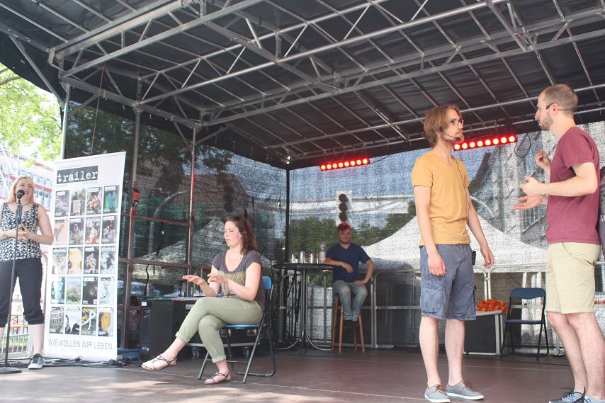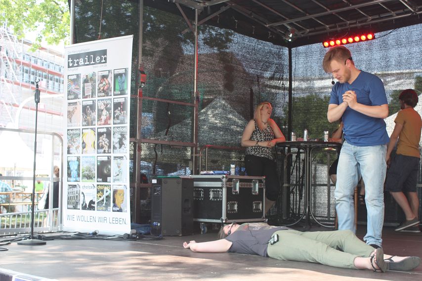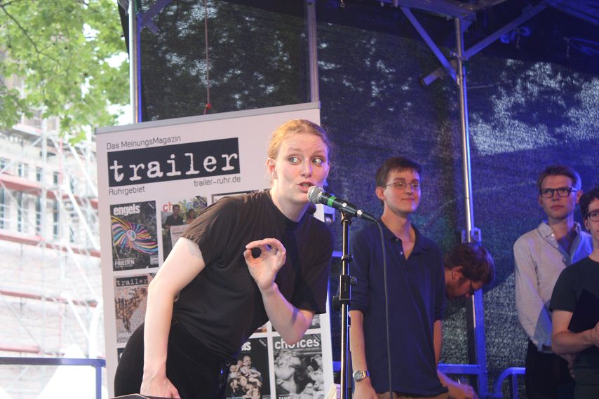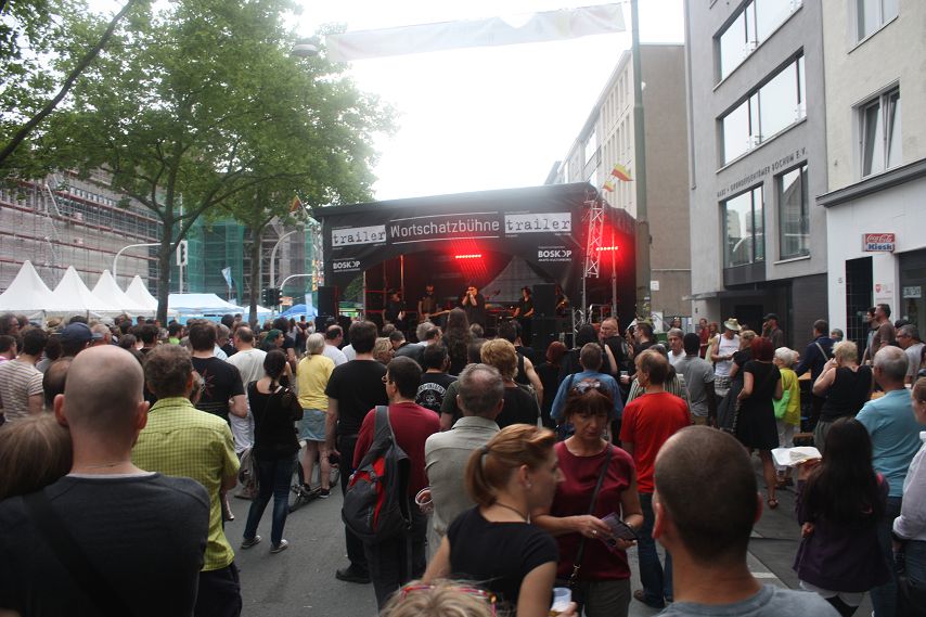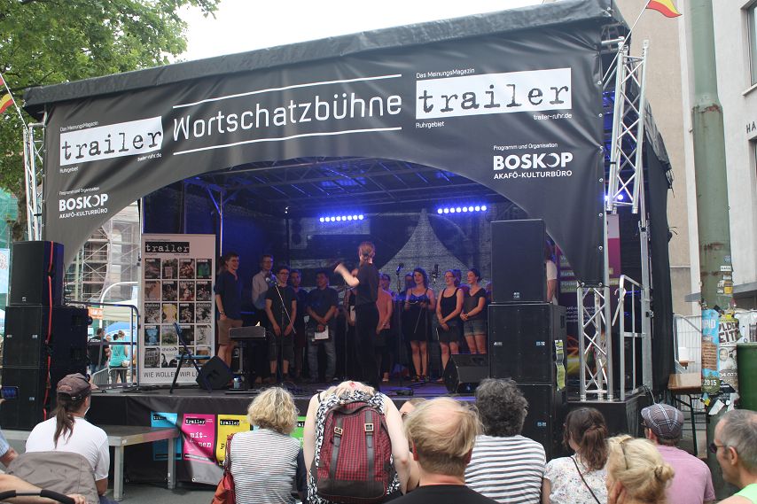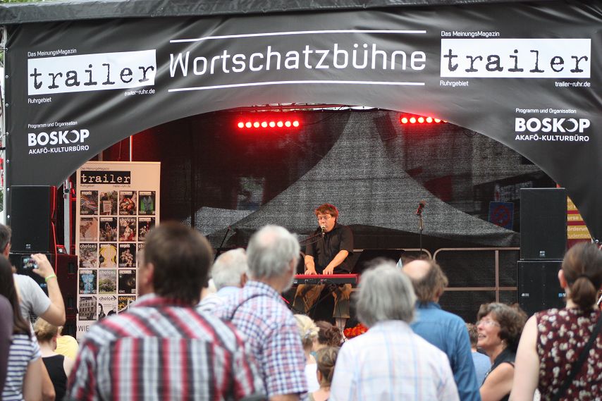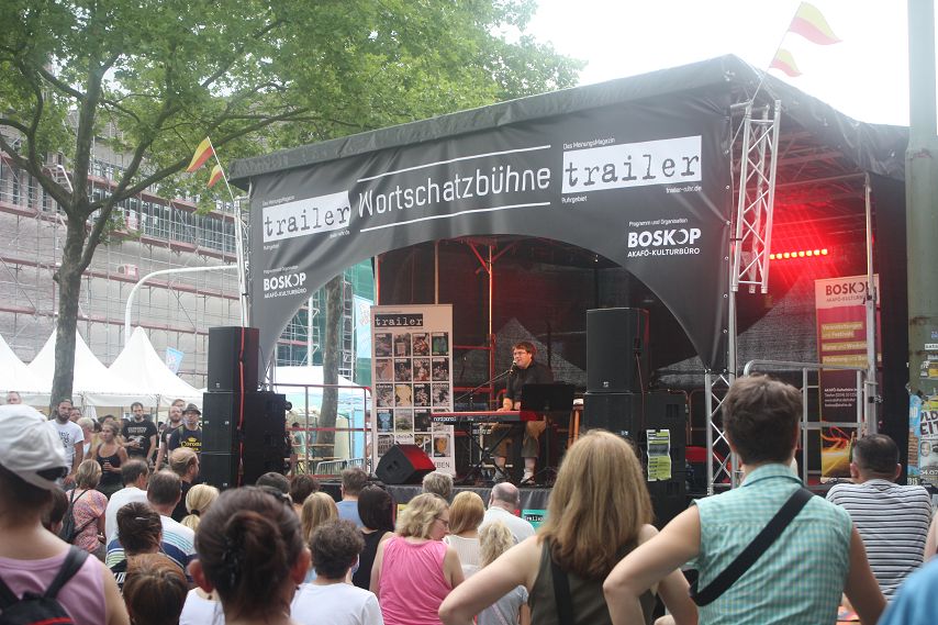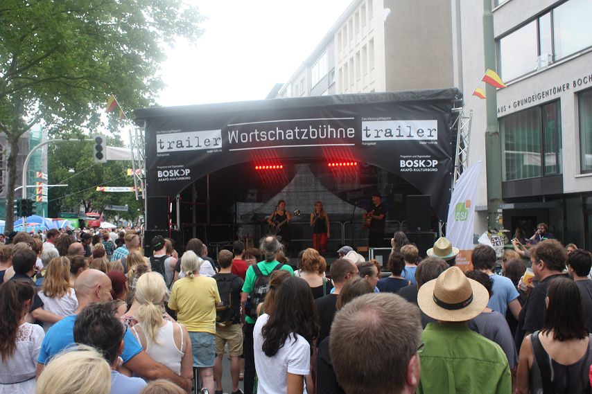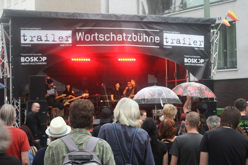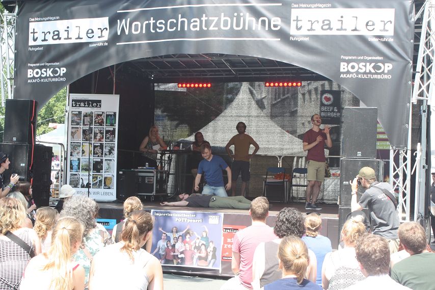 Es war abzusehen. Drei Tage lang genossen die Besucher von Bochum Total Temperaturen von weit über 30 Grad. Dass es irgendwann die Quittung geben musste, war klar. Schon morgens hatte es kräftig gewittert und man durfte vermuten, dass jenes Unwetter sich auch dafür verantwortlich zeigte, dass zeitweise so gut wie keine Züge die Strecke Wattenscheid–Mülheim passieren konnten. Bochum war kurzzeitig vom öffentlichen Regionalverkehr abgeschnitten. Sicherlich war dies auch ein Grund dafür, dass es zum Programm-Start der trailer-Wortschatzbühne um 14 Uhr noch recht leer in der Stadt war. Ein Publikum adäquater Größe erspielte sich das Impro-Theater „Pottpourri“ aber in Windeseile und auch das Wetter hatte sich zu diesem Zeitpunkt längst wieder beruhigt und überzeugte mit gewohnter Hitze.