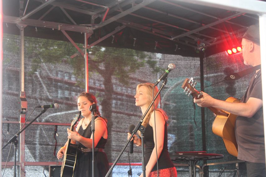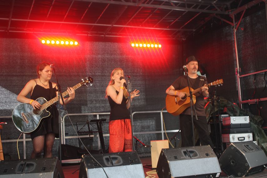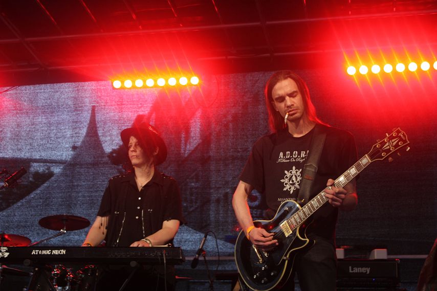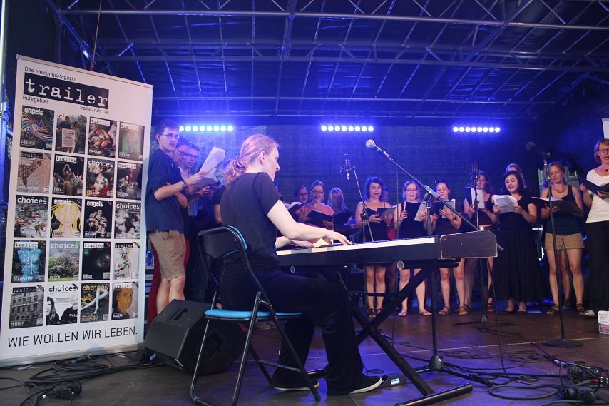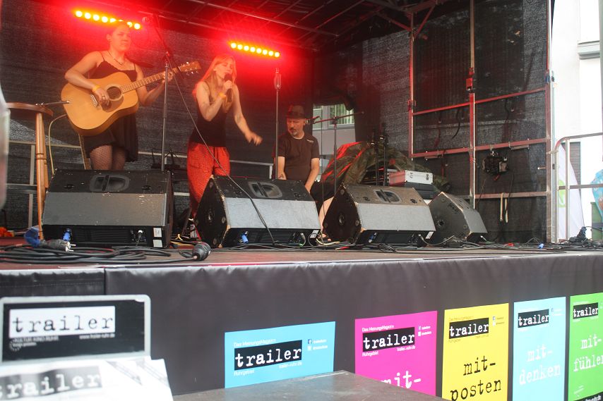 Das Wetter beruhigte sich allmählich, das große Gewitter blieb aus, so dass mit leichter Verspätung die Hunkey Dorys die trailer-Wortschatzbühne betreten konnten. Mit zwei Akustik-Gitarren und Cajon bewaffnet, spielte sich das sympathische Trio durch ein kurzweiliges Set voller Folk-Pop-Stücke. Trotz gelegentlicher Schwierigkeiten mit der Technik ein gelungener Auftritt der jungen Band. Passend zum Sonnenuntergang und erneut aufziehenden Regenwolken zog Klaus Märkert mit der Band Atomic Neon den Vorhang zu. Der Kult-Autor der düsteren Szene lockte viele schwarz gekleidete Gestalten vor die trailer-Wortschatzbühne. Die düsteren Geschichten, nicht frei von schwarzem Humor, wechselten sich mit den Dark-Wave-Songs von Atomic Neon ab. Hier eine short story über liebgewonnene Spinnen auf TV-Geräten und endlose Fahrten zu Reha-Kliniken, da Songs über Sehnsucht, Krankheit und Hoffnung. Thematisch gaben sich Autor und Band die Klinke in die Hand. Das Publikum zeigte sich mehr als angetan vom programmatisch äußerst morbiden Abschluss des Abends und stürmte anschließend den Merch-Tisch der Künstler.