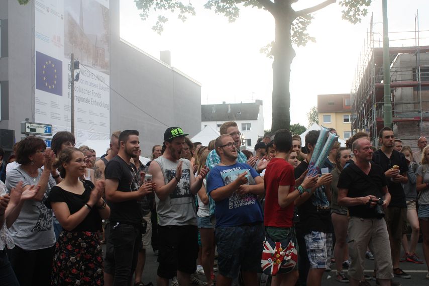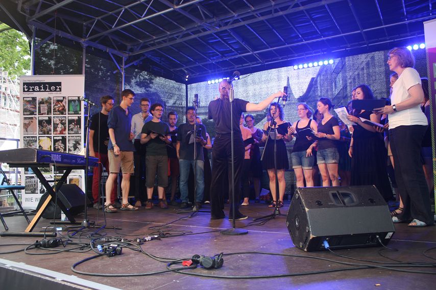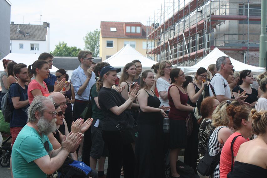 Dann war es Zeit für mehrstimmige Lieder über Knoblauch und andere wichtige Dinge des Lebens. Der Chor des AKAFÖ Bochum unterhielt gut 20 Minuten mit kurzweiligen Liedern, ehe die von vielen Zuschauern vorsorglich eingepackten Regenschirme das erste Mal zum Einsatz kamen. Gut, dass nun erst einmal Pause war.