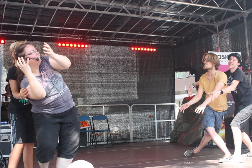 Das Prinzip der Vorgehensweise der jungen Theatergruppe war schnell erklärt: Gespielt werden beliebige Szenen, die das Publikum vorschlägt. Der Moderator unterbricht zeitweilig und erschwert das Spiel durch gewisse, teils abstruse, Auflagen. So wurde das sich von einer jungen Dame im Kindergartenalter gewünschte Märchen „Schneewittchen“ zu einer Lachnummer im positiven Sinne. Der größte Gag: Auf die Frage, wie ihr es denn gefallen hätte, antwortete die ca. fünfjährige Kritikerin ganz trocken: „Ach ja, ganz ok. Das mit dem Spiegel hätte besser sein können“. Die anschließende Performance konnte dann aber wirklich jeden überzeugen. Die Figuren: Chef einer Auftragskiller-Agentur, Sekretärin und Mord-Praktikant . Der Plot sollte im Spiel entstehen. Kein Problem für ein Improtheater, wären da nicht gewisse Vorgaben zu beachten. Bei jedem „Ja“ oder „Nein“ der Schauspieler wurden die jeweiligen Figuren mit einem Handicap belegt. Am Ende durfte sich das Publikum über eine blinde, lispelnde, von Tourette geplagte Sekretärin mit französischem Akzent, einen dreiarmigen Agentur-Chef und einen sich ständig am Kopf kratzenden Praktikanten schlapp lachen.