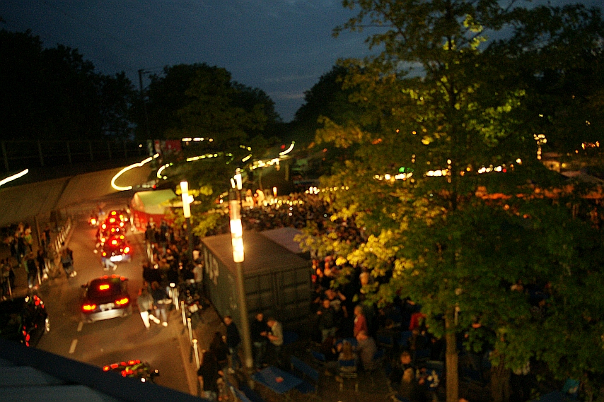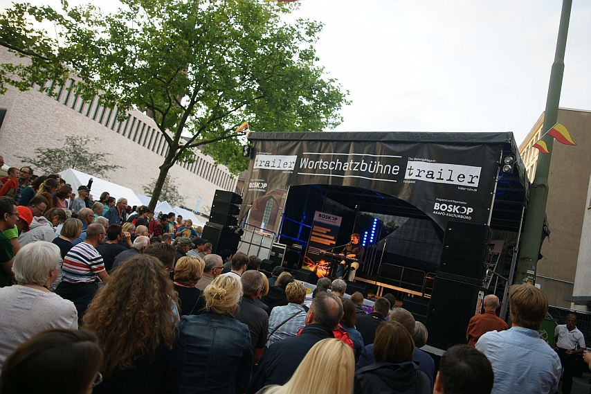 Gegen 19 Uhr stand ich wieder an der trailer-Wortschatzbühne, versunken im vorbeiziehenden Fluss der Kulturen und Subkulturen. Während es gestern noch die Vielfalt der Charaktere und Atmosphäre war, die mich begeisterte, war es heute die schlichte Masse an Menschen, die sich langsam auf der Straße fortbewegte und die mich in eine leicht melancholische Stimmung zu versetzen schien. Ich ahnte warum, doch wurden meine Gedanken von einer wirklich wunderbaren Stimme unterbrochen, die sich, ohne kitschig klingen zu wollen, wie ein dämpfendes Tuch im Umkreis auslegte. Es ging nicht nur mir so, denn viele Leute blieben nach und nach stehen, lauschten, setzten sich oder lehnten sich an eine Wand, um ein wenig in Ruhe zu tanken.