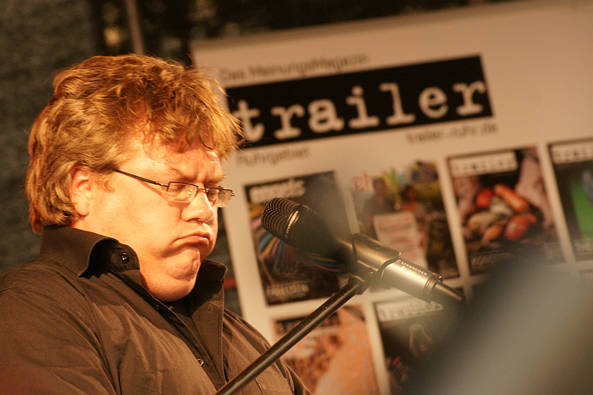 Für mich hieß es jetzt warten und zwar auf Kabarettist Matthias Reuter. Vielen bekannt, u.a. durchs Radio und berüchtigt wie bewundert für sein gewieftes Kabarett mit Klavier-Einlagen. Ich vertrieb mir die verbleibende Zeit mit den Einstellungen meiner Kamera, bis der gebürtige Oberhausener, der außerdem Germanistik, Geschichte und Philosophie studiert hat, um 20.15 Uhr die trailer-Wortschatzbühne betrat.