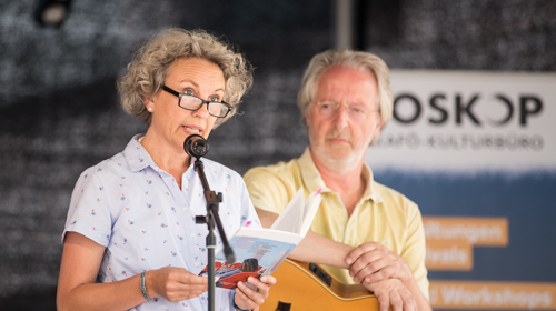 Die Bettina-von-Arnim-Preisträgerin Anja Liedtke kommt auf die Bühne und ist etwas irritiert. „Dann suchen wir mal den richtigen Text“, beginnt sie den Soundcheck. Sie liest aus ihrem neuen Buch ‚Blumengeschichten und Minenfelder’. „Du bist überhaupt noch nicht dran“, weist sie Thomas Aigner – ihren Mann – zurecht, der sie auf der Gitarre begleiten wird. 2011 war Anja Liedtke für Aktion Sühnezeichen Friedensdienste in Jerusalem – eine Reise zu Holocaust-Überlebenden. Daraus entstand später dieses Buch.