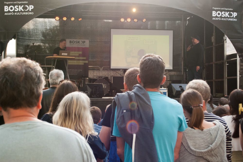 Wir wechseln kurz die Kunstform. Und zwar präsentieren um 19 Uhr zwei Künstler ihre Kunst, die sonst nur selten auf Bühnen zu finden ist. Oli Hilbring und Michael Holtschulte sind nämlich Cartoonisten. In dem Programm „Zwei Stricher packen aus“ präsentieren sie ihre Zeichnungen, lesen sie vor und kommentieren sie. Selbstironisch und einander neckend. Sich einen Cartoon nach dem anderen anzusehen, wird nach einer Weile etwas eintönig, doch gerade, bevor der Hänger kommt, wissen die beiden, Multimedia einzusetzen! Und schon wird klar, dass AC/DCs „Thunderstruck“ ein Angler-Song ist: „Ahahahahaahaaha … Zander!“