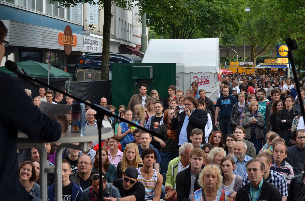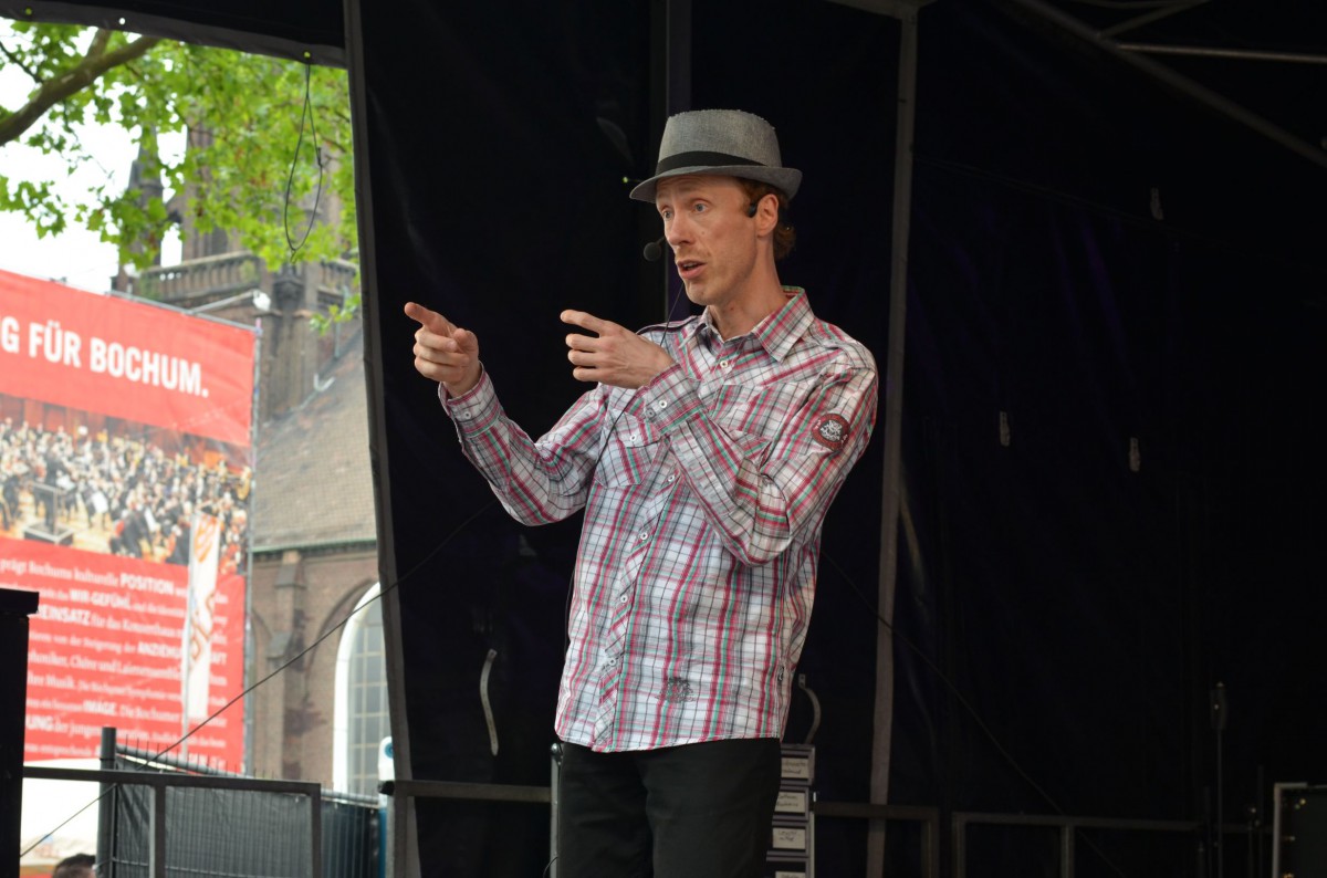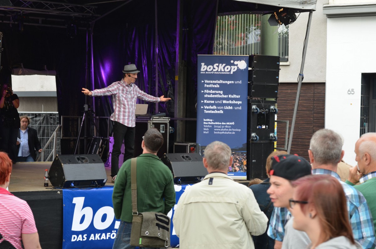 Musik ist bei Bochum Total allgegenwertig. Die trailer-wortschatzbühne präsentiert sich auch in diesem Jahr verlässlich und sorgt mit meist wortgewandter Kleinkunst zwischen 1Live- und Sparkassenbühne für einen abwechslungsreichen Gegenpol auf dem zum Kult gewordenen Stadtfestival mitten im Ruhrgebiet. War es letztes Jahr noch schwierig, die ersten Künstler auf der Bühne aufgrund von massiver Sonneneinstrahlung klar und schweißfrei zu beobachten, zeigte sich der Wettergott heute gnädig und bescherte milde Temperaturen ohne Blendgefahr.