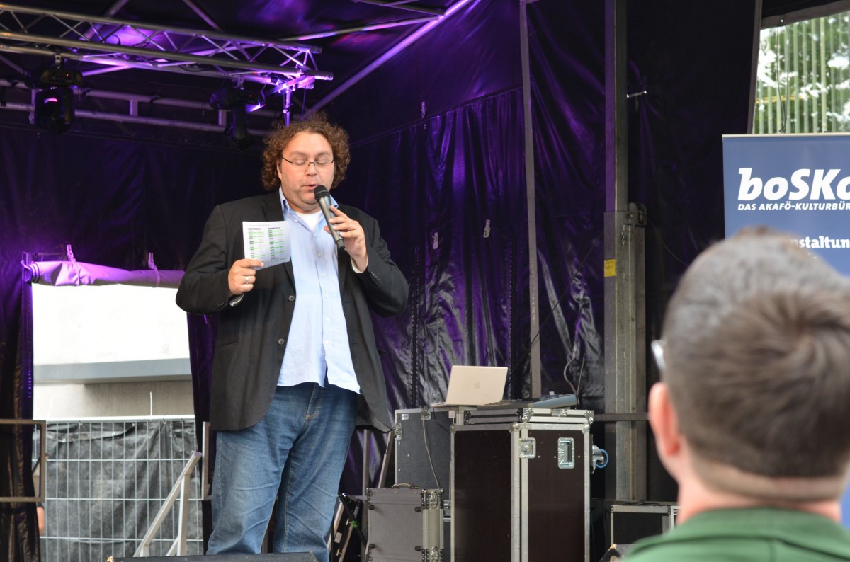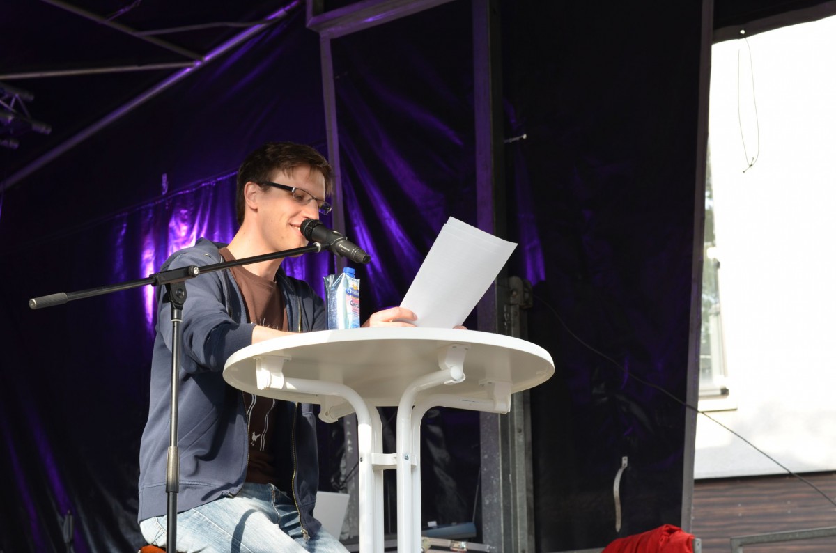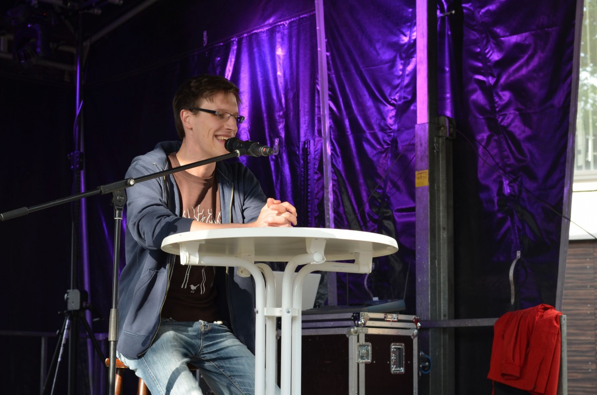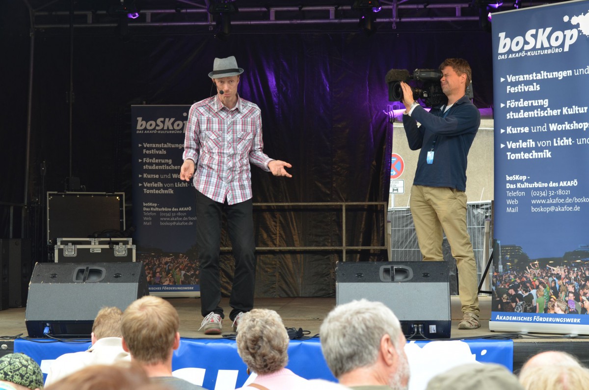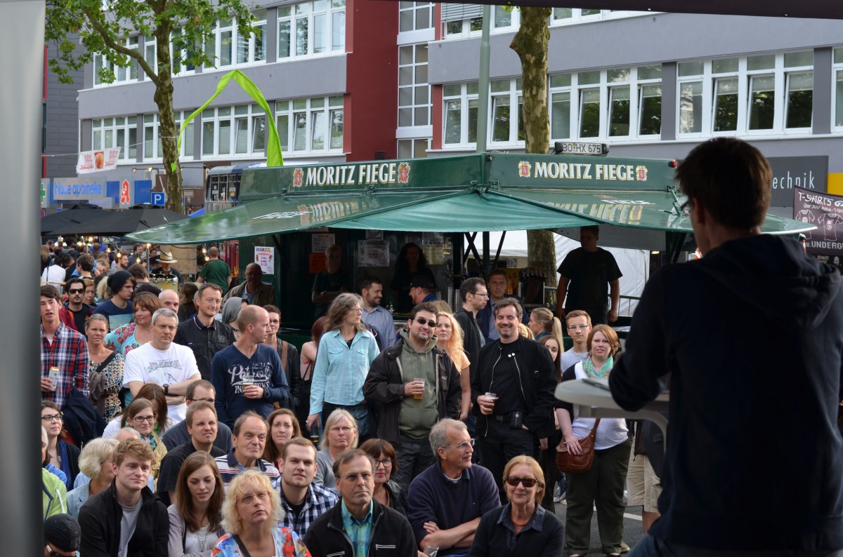 Mit minimaler Verspätung begab sich um 17:45 Uhr der erste Künstler auf die Bühne, um die zahlreich wartenden Zuschauer zu unterhalten. Laut Programm sollten nun 30 Minuten Bochumer Studierende mitgebrachte Texte vortragen. Stattdessen gab sich jedoch ein waschechter Märchenerzähler die Ehre. Sein Name: einfach nur „Bernd“. Seine Ausflüge in fabelhafte Welten voller Intrigen und langer Hakennasen entpuppten sich, passend zur Tageszeit, vor allem als kinderfreundlich. Ein familienfreundlicher Einstieg.