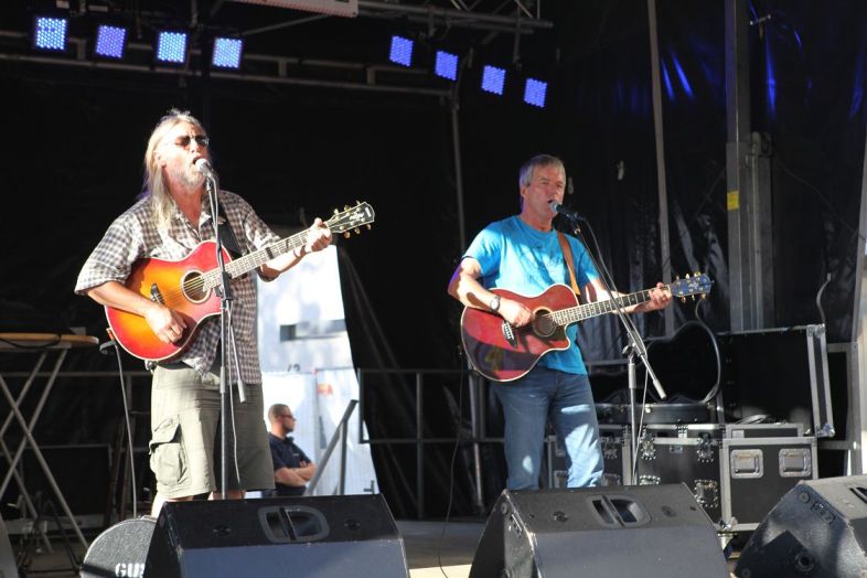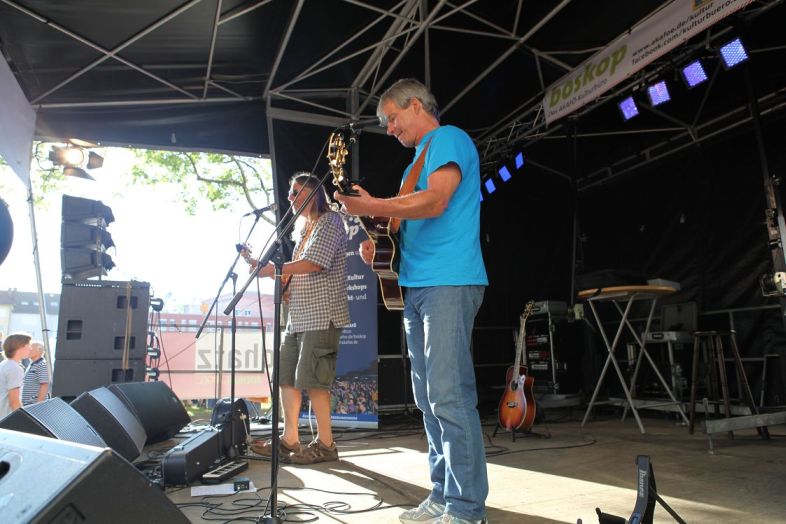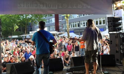 Mit Fußball hatte der Auftritt von Ape & Feuerstein hingegen nichts zu tun. Die Altmeister des politischen Musikkaberetts und Stammgäste der trailer-Wortschatzbühne besannen sich auch 2014 auf ihre Stärken: Muntere Lieder zwischen Folk, Blues und Pop mit dem nötigen politischen Biss. Studierte Politiker und ihre vorgefertigten Karrieren bekamen ebenso ihr Fett weg wie der Banker als potenzieller Schwiegersohn. Ape & Feuerstein sind alte Hasen im Geschäft und sie kennen ihr Publikum. Trotzdem war von Routine auch an diesem Tag nichts zu sehen, und der Wille, sich neue Fans zu erspielen, war stets präsent. Sogar ein paar Teenager ließen sich 30 Minuten bestens unterhalten, und vielleicht wurde so auch bei ihnen die eine oder andere gesellschaftspolitische Debatte in der Peergroup angestoßen.