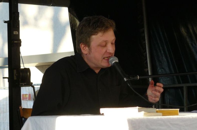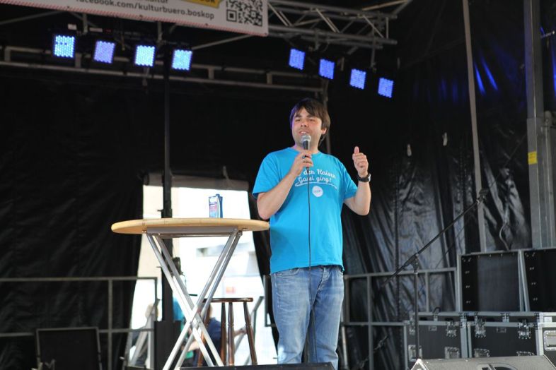 Pünktlich um 17.45 Uhr, nachdem es sich die ersten Bands nach ihren Auftritten schon wieder in den Eisboxen im Backstage gemütlich machten, begrüßte das sich sonnende Publikum den ersten Künstler auf der Bühne. Kein Geringerer als Ben Redelings machte den Auftakt auf der trailer-Wortschatzbühne. Der 1975 in Bochum geborene Autor und Filmemacher ist schon lange kein unbekannter mehr im Ruhrpott. Insbesondere sein ständig neu befüllter Blog und seine Leseshows unter dem Namen „Scudetto“ machten den unscheinbar wirkenden jungen Mann zu einem der führenden Fußballkabarettisten. Seine zum Teil extemporiert wirkenden Geschichten sorgten für die ersten Lachfalten der Anwesenden und animierten auch Teile des Laufpublikums zum Verweilen. Es wurde erinnert an Wolf-Dieter Ahlenfelder, den Schiedsrichter aus Oberhausen, der mit ordentlich Promille eine Halbzeit nach 32 Minuten abpfiff, an Thorsten Legat und seine fragwürdige Kochshow. An Helmut Kohl, den mannschaftsnahen Bundeskanzler und an polarisierende Typen wie Paul Gascoigne. Zum Schluss erheiterte Redelings sich und die Zuhörer mit einer Auswahl der besten WM-Sprüche. Ein Highlight: „Fußballspielen könnt ihr sowieso nicht, also hindert wenigstens die anderen daran“ (Ansprache von Franz Beckenbauer als Trainer der Nationalmannschaft vor dem WM-Endspiel 1986 gegen Argentinien).