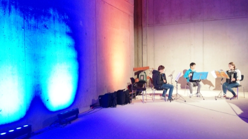 Ein bunt gemischtes Publikum versammelte sich im Viktoriaquartier, um der frühabendlichen Zeremonie bei Dämmerungsbeginn beizuwohnen. Mehrere hundert Menschen von Jung bis Alt blickten erwartungsvoll auf den farbenfrohen Richtkranz zwischen Marienkirche und Neubau. Und schon vor Beginn der Feierlichkeiten ging es musikalisch zu im Musikzentrum: Ensembles der Musikschule spielten in den Räumlichkeiten der Kirche, die jahrelang leer stand und in das Musikzentrum nun als Foyer integriert werden soll. Dass ein Kirchenschiff als Foyer etwas ganz Besonderes sei, war von vielen Besuchern immer wieder zu hören, während sie durch die bunt beleuchteten Räume spazierten.