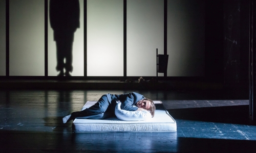 So ist das mit den Plänen. Es kommt darauf an, ob es welche gibt und wer überhaupt den Plan hat. Keinen Plan hat in „Tod“ von Woody Allen jedenfalls ein gewisser Kleinmann (Alber Bork), den die Bürgerwehr mitten in der Nacht aus Schlaf und Bett reißt, um auf Patrouille zu gehen. Man sucht einen Mörder und die aufrechten Bürger fühlen sich nicht geschützt. Das Theater an der Ruhr hat Allens frühe Groteske genutzt, um das offensichtlich gestörte Verhältnis der Bürger zu ihrer Sicherheit zu karikieren. „Bürger! Schützt Euch selbst!" mit diesem Schlachtruf stürmen die militanten privaten Schutzmächte in Kleinmanns Schlafzimmer, das geschickterweise gleich auf der Mainstreet mit gelber Bordsteinkarte steht. Die Hausfassade ist milchig-transparent und lässt die Protagonisten per Scheinwerfer riesige Schatten werfen. Roberto Ciulli inszeniert fast ohne Wechsel und Pause, gerade noch im Schlafzimmer versammelt sich die Bürgerwehr im Headquarter, Kleinmanns Bett wird zerlegt und installativ als Requisite verwendet, während der wie ein Schlafwandler durch die Szenen taumelt. Er jedenfalls hat keinen Plan, ist müde, überarbeitet, aber er will natürlich nicht ausgeschlossen sein.
