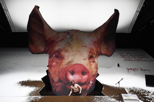 Und so erzeugt die Inszenierung einen durchaus amüsanten Abend, bei dem Schweinemasken und eine riesige schneeweiße schiefe Ebene die EU symbolisieren, auf der die sechs Protagonisten in zig Rollen oft, sehr oft ins Rutschen kommen. Der Schweinebauer Florian Susman, der massig Schweineohren-Abfall nach China exportieren will und als Präsident der European Pig Producers ausgerechnet auf seinen introvertierten Bruder Martin hofft, zieht dafür alle bekannten und unbekannten Register. Bombenstimmung in den Gremien. Tautologien werden zu Dauerschleifen, wenn es darum geht, das wohl angeschlagene Image der EU (wie kommt Menasse bloß darauf?) zu verbessern. Ein teures „Big Jubilee Project“ wird angedacht und durchläuft nun endlos die Gremien, die alle ihren Senf dazu geben wollen. Ablehnung durch Zustimmung ist dabei ein bewährtes System. Im zweiten Teil reißt Schmidt-Rahmer die schiefe Ebene auf, ein Riss entsteht aus dem ein riesiger Schweinekopf quillt. Diesen Spalt schließt niemand mehr.