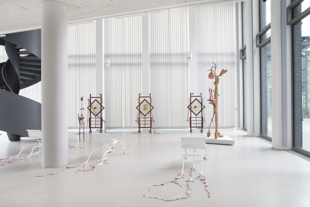 Ganz schön frech: Dass es in Nils Alix-Tabelings Ausstellung um Subversion, zivilen Ungehorsam und Jenseitiges der Norm geht, sieht man seinen Objekten schon rein formal an. Sie sind kein bisschen dekorativ und gefällig. High and Low gehen munter durcheinander beziehungsweise gut zusammen, auch in der Auswahl der Materialien. Der junge Franzose, geboren 1991, kombiniert Fundstücke, Ohrringe, Schneckenhäuser, Kristalle, Stoffstreifen, Kerzen, Wolle, Pflanzenteile und Ziegendarm mit hochpolierter Holzschnitzerei, Schmiedearbeit, 3D-Objekten und handwerklich feinster Motivstickerei. Die scheinbar chaotischen Basteleien entpuppen sich beim näheren Hinsehen als sehr präzise ausgearbeitet. Jedes Detail und Material ist kalkuliert eingesetzt und verknüpft – oft zu fragilen Monstern aus Mensch und Möbelstück, verstörend und faszinierend. Wie z.B. „L'Hernie Hiatale“, eine kleine knietief aufgestellte Figur aus Holz, Aluminium, Epoxidharz, Eibischwurzel und Heilpflanzen mit breitkrempigem Hut. Wer sich zu ihr hinunterbückt, blickt in eine erschreckend verzerrte Fratze.