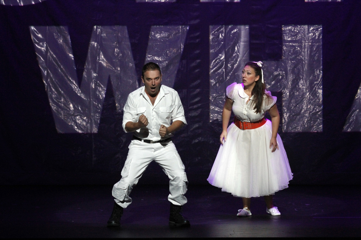 Veronika Haller als Dame, die im goldenen Glitzergewand und mit dunkel fundiertem Sopran die kapitalistische Shopping-„Kultur“ verkörpert, sowie der Tenor Thomas Paul als Kavalier sind ein ebenso begeisterndes Duo. Geklärt wird die Mordserie übrigens maßgeblich vom Goldhändler. Ivo Stánchev tritt mit profundem Bass überraschend aus dem Publikum auf die Bühne. Der Mörder endet als stilisierter Christus aufgehängt an einer Bühnenstrebe – und mit der finalen Frage: „Wozu Kunst?“