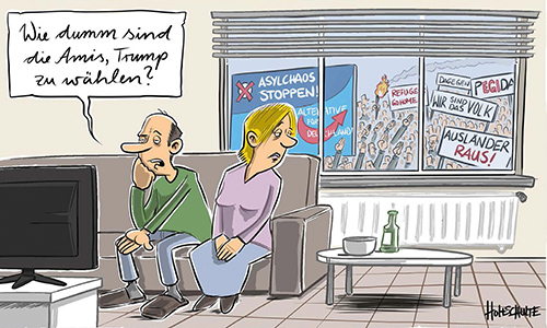 2017 war ein goldenes Jahr – zumindest für Cartoonisten und Karikaturisten. Den meisten fällt beim Blick zurück wohl zuerst der Name Donald Trump ein. Nach dessen Vereidigung zu Anfang des Jahres hat dieser, sagen wir mal, außergewöhnliche Politiker im mächtigsten Amt der Welt durchgängig die Schlagzeilen bestimmt und immer wieder für nicht möglich gehaltene Ausraster gesorgt. Kein Wunder, dass das „Trumpeltier“ auch die 8. Ausgabe von „Beste Bilder – Die Cartoons des Jahres“ dominiert und betitelt. Doch auch wenn „The Donald“ sich stets als zuverlässiger Krisenanheizer verstand, nicht alle Brandherde gingen ursächlich auf ihn zurück. Da gab es noch: Die Türkei unter Erdoğan, Rote Knöpfe in Nordkorea, AfD im Bundestag, ein ewig andauerndes Luther-Jubiläum, G20-Randale und und und….In der beliebten Reihe „Cartoons im Pott“ in Herten findet nun eine Best-Of-Ausstellung dieser Jahres-Auswahl statt. Bis Anfang März kann man sich schmunzelnd zurückerinnern an ein Jahr, das fast schon wieder weit weg wirkt – nur Donald „Drecksloch“ Trump bietet schon wieder neues Futter für die Cartoonisten.