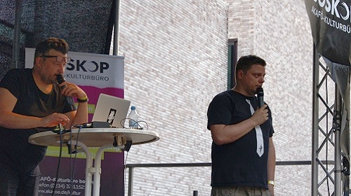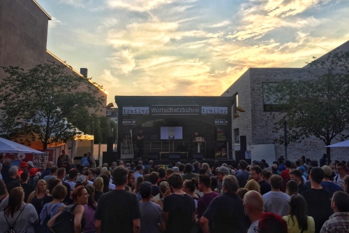 Security-Personal blickt auf Festivals in der Regel ernst und diszipliniert. Augen und Aufmerksamkeit sind zu hundert Prozent auf die Sicherheit der Gäste gerichtet. So auch auf der trailer-Wortschatzbühne. Doch was soll der Verantwortliche in der neongelben Weste machen, wenn er mit dem Rücken zur Bühne in Publikumsgesichter blickt, die ständig loslachen bei dieser gemeinsamen, multimedialen Dia-Show von Oli Hilbring und Michael Holtschulte? Bei den Pointen kann sich der Kollege von der Security ein seriöses, verschmitztes Lachen nicht verkneifen. Als Oli Hilbring einen Cartoon aus seiner Reihe „Flacher Freitag“ präsentiert, schielt er mit auf den Bildschirm. Ein Arzt teilt dort einem Patienten mit, dass er an einer „südamerikanischen Augenkrankheit“ leide. Der Betroffene schreckt auf: „Oh Gott, ich Chile.“ Da prustet auch das Sicherheitspersonal gemeinsam mit dem Publikum los. Die Karikaturisten tragen zur ausgelassenen Stimmung bei diesem Festival bei: gemeinsam Cartoons gucken, gemeinsam lachen.