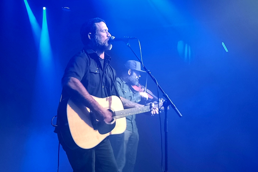 Falls jemand die Stimme von Matze Rossi als rau und kratzig empfunden haben sollte, wird dieser Eindruck relativiert, als Chuck Ragan die Bühne entert. Chucks Stimme ist unglaublich. Sie klingt, als hätte jemand Bruce Springsteen die Stimmbänder von Lemmy Kilmister eingepflanzt – ohne Narkose. Während Hot Water Music mit harten Gitarrenriffs zum Crowdsurfen einladen, frönt Chuck Ragan solo einer Melange aus Folk und Americana. Von daher ist der Springsteen-Vergleich gar nicht zu weit hergeholt, auch wenn Ragan weniger ein Geschichtenerzähler ist als der Boss. Kraftvoll aufstampfend gibt er den Takt vor, lässt die Bühne beben, da hält sich der Punk unter dem Folksound nicht zurück. Jon Gaunt, mit dem Ragan unter anderem bei dem All-Star-Bandprojekt The Revial Tour bereits zusammenarbeitete, lässt dazu den Bogen filigran über die Geigenseiten flitzen. Die Geige übernimmt mal Soloparts, mal gibt sie die zweite Stimme zu Ragans Vocals – quasi im Dialog. Die beiden Musiker sind gut aufgelegt, obwohl es in hinteren Bereich der Halle offenbar Leute mit viel Gesprächsbedarf gibt, die statt ihrer Stammkneipe ein Konzert zum ausgiebigen Klönen ausgewählt haben. „Meet You in the Middle“ und natürlich „The Boat“ zählen zu den Highligts des Gigs, der von den Fans gefeiert wird. Trotz des anhaltenden Jubels kehren die beiden Musiker weder für eine Zugabe noch für eine letzte Verbeugung auf die Bühne zurück – was am Ende eines ansonsten großartigen Abends ein etwas zwiespältiges Gefühl hinterlässt.