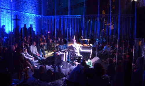 Immer sonntags, immer 19 Uhr, immer 10 Euro, einmal im Monat, jedes Mal mit der Option, bisheriges Denken und Fühlen über Musik durcheinanderzuwirbeln. Mal Jazz, mal Ambient, dann Klassik oder Electro-Swing, zwischendurch Indie-Pop und dann wieder Minimalismus – Hauptsache live und intensiv. Der 10x10m große Kubus aus transparenten PVC-Lamellen, den die Bochumer Jungs und Mädels vor dem Altar der Christuskirche als Kristallisationsraum des musikalischen Geschehens aufstellen, ist das Gegenteil einer sicheren und bequemen Genreschublade. Draußen vor der Kirche der Platz des europäischen Versprechens, drinnen der Kubus als Platz des musikalischen Versprechens: immer anders, immer gut.