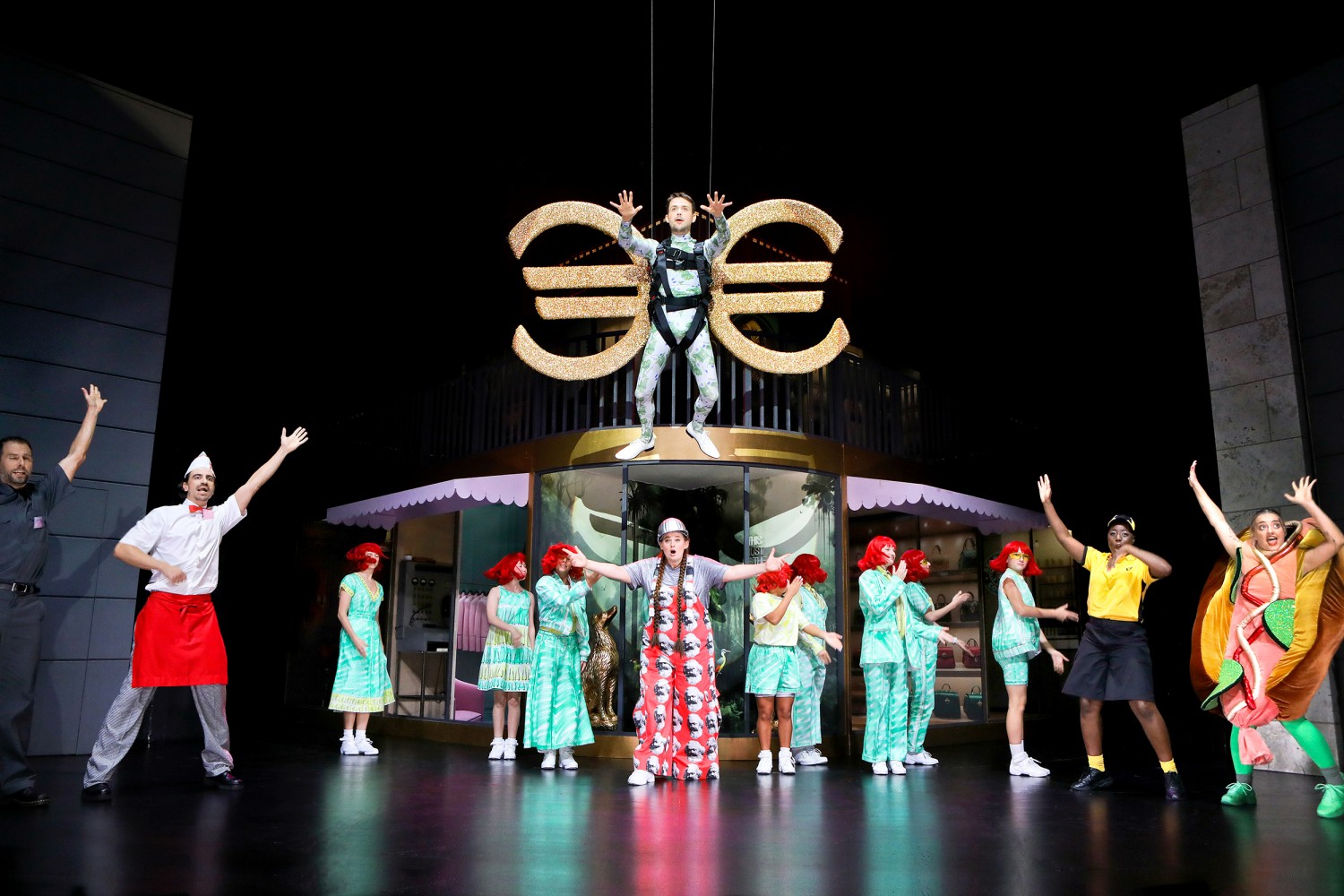 Für ein paar Minuten klingt es wie ein Marx-Lesekreis, was Marlena Keil mit Bauhelm und knallrotem Suit aus Konterfeis des bärtigen Philosophen vorträgt. Doch seiner „Kritik der politischen Ökonomie“ an den Produktionsverhältnissen und dem ideologischen Überbau wird nur ein Prolog gewidmet. Was folgt, ist eine glatte Musicalnummer, die dem Geld in all seinen Facetten huldigt: als Macht, als Luxus und als Identität. Bis Lukas Beeler als Flattermann aus Euro-Symbolen die Premiere unterbricht. Ein Streik inmitten der Aufführung. Er träumt davon, diese Inszenierung bombastischer aufzuziehen – mit Broadway-Stars, mit prominenten Film-Gesichtern und vor allem: mit viel Geld.
