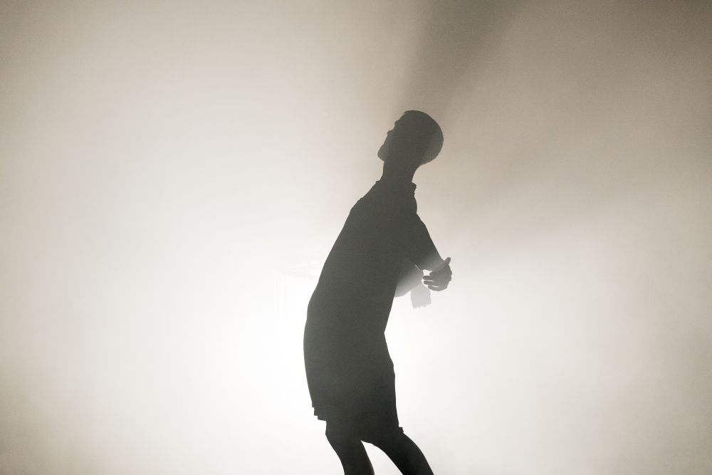 Dann ist der Höllenkreis erreicht. Die dramatische Wendung fegt den „grauen Alltag“ beiseite, stürzt die Szenerie ins Schwarz; eine mächtige Laterne am Kran dreht sich nun minutenlang konzentrisch über den Kreisen auf der Bühne, blendet und dröhnt. Das Inferno ist da. Traumatische Bilder mit skurrilen Gestalten wehen unter und neben dem rotierenden Licht in der Dunkelheit. Rüping wird hier sehr künstlerisch bildend – das Visuelle hat etwas von kinetischer Kunst, gepaart mit Hieronymus Bosch. Schließlich ist die Gegenseite erreicht, das Quartett trifft auf die tote und doch alt gewordene Beatrice, die so ganz anders scheint, als Dante sie in den Oden beschrieben hat. Jetzt geht es mit der Grand Dame Viviane De Muynck um das Altern und Sterben und um die Frage nach Ursache und Wirkung der Dichtung. Könnte es sein, dass nur die Unerreichbarkeit der Liebe die Inspiration beflügelte? Beatrice argumentiert schelmisch. Ein intensiver Abend endet spektakulär mit Mega-Spinnennetz-Fallschirm und einer guten Nachricht von Rapper Danger Dan.