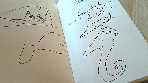 Kann ja mal passieren, dass man sich im Datum irrt. Hätte man vorher nochmal einen Blick in den trailer-Literaturkalender werfen sollen. Wirklich peinlich hingegen ist die Situation, wenn man selbst verantwortlich für den trailer-Literaturkalender ist und diese Lesung auch noch als besonders empfehlenswert hervorgehoben hat – und wenn man nicht zuletzt vor Ort ist, um über die Lesung zu schreiben. Hiervon ahnt Buchhändler Peter Kolling nichts, als er mit aufmunternd gemeinten Worten auf die im Kassenbereich liegenden Bücher deutet: „Aber der Autor hat noch ein paar Bücher signiert – in jedem Exemplar mit einer kleinen Zeichnung – suchen Sie sich eins aus.“ Und in der Tat: Neben der Signatur Franzobels finden sich skizzierte Segelschiffe, grinsende Wale oder ein putziges Seepferdchen. Wer einen Roman, der einen grausamen Überlebenskampf auf hoher See schildert und drastisch von Amputationen und Kannibalismus berichtet, mit solch spielerischen Vignetten ziert, den hätte ich schon gerne live erlebt. Na ja, die Chance ist verpasst. Wir entscheiden uns für das Buch mit der Seepferdchen-Zeichnung, auf das Floß des menschlichen Ausnahmezustands werden wir uns auf der heimischen Couch lesend begeben. Zu einer leckeren Pho beim Vietnamesen ganz in der Nähe erklingen irritierenderweise Wiener Walzerklänge.