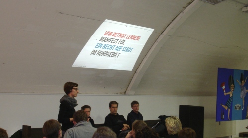 Nach rund einer Stunde interessanter Diskussionen bringt es eine Besucherin der Veranstaltung mit ihrer Frage frech auf den Punkt: „Was genau können wir denn jetzt von Detroit lernen“? Ein verlegenes Prusten raunt durch die Halle. Das, nachdem das Manifest schon längst präsentiert wurde, man schon längst in der Diskussion über verschiedene Aspekte steckte: Über Eigentum und Bodenbesitz. Über die freie Kunstszene im Ruhrgebiet. Schließlich über das, was das Ruhrgebiet denn nun sei, eine Großstadt oder eine lose Aneinanderreihung von Käffern? Gemeinsamkeiten zwischen der fordistischen Industriestadt in den USA und der – bald ehemaligen – Opelwerksstadt Bochum werden auch erst seit dem „Detroit Projekt“ aufgezeigt: Und es gibt offensichtliche Ähnlichkeiten zwischen dem Wandel am Lake Michigan und in der Region entlang der Ruhr: Beiden Ballungsräumen geht die Industrie flöten, die Autoproduktionsstätten in Detroit, im Ruhrgebiet seit den 60ern die Montanindustrie, später folgten bis in die Gegenwart weitere Schließungen von Produktionsstätten, wie nun auch das Opelwerk in Bochum. Die Deindustrialisierung ist damit im Ruhrgebiet noch nicht abgeschlossen, die Folgen sind verheerend: Arbeitslosigkeit, Schrumpfung und ein, wie es im Manifest heißt, „Armutsgürtel, der nördlich der A40 von Duisburg nach Dortmund quer durchs Ruhrgebiet zieht." Aber Detroit soll Beispiele geben wie, man aus der Misere rauskommt.